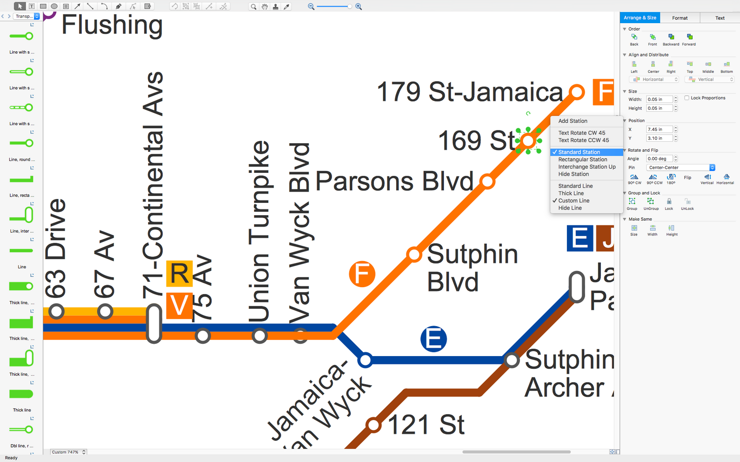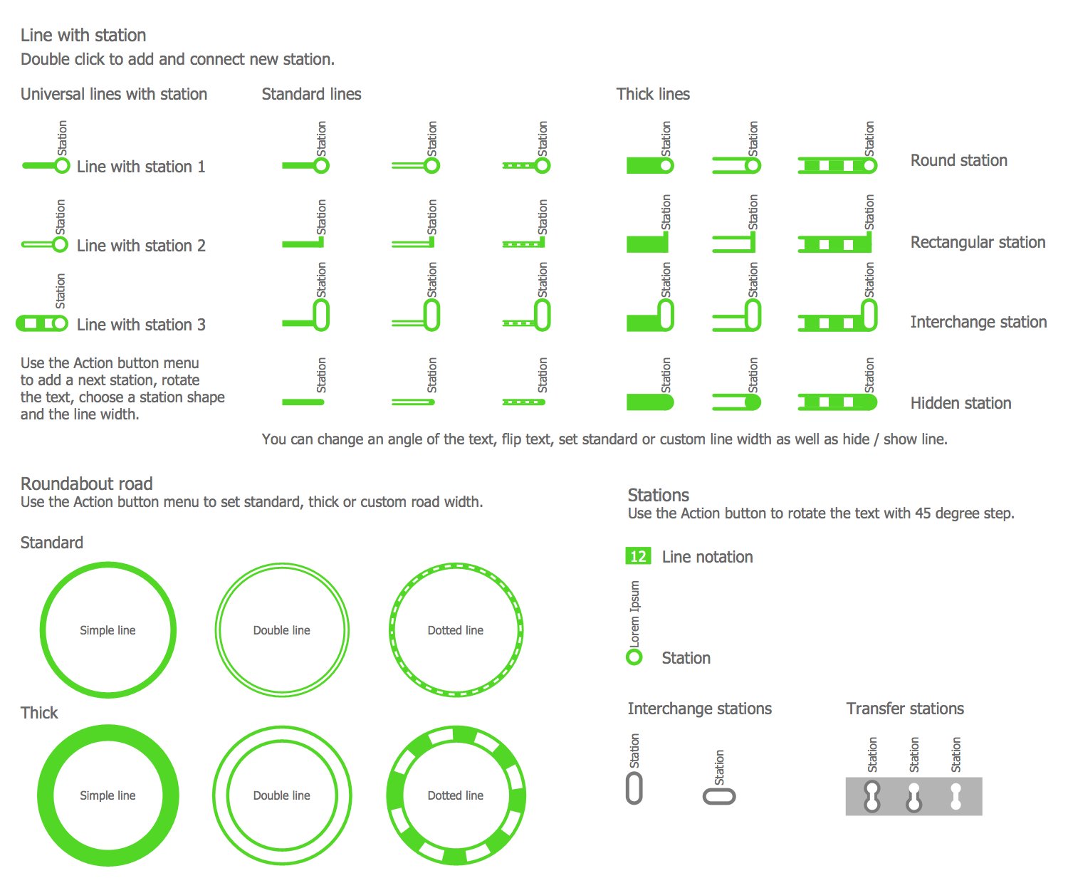 The Metro Map solution enables to create the needed metro maps, bus and other transport maps and transport schemes, as well as the tube-style infographics and route maps, allowing one to control the direction in which any ConceptDraw DIAGRAM user can create new stations, add text icons/labels and change the lengths of the pre-made drawings as the solution contains such design objects as the representations of the Lines, the Landmarks, and the Stations.