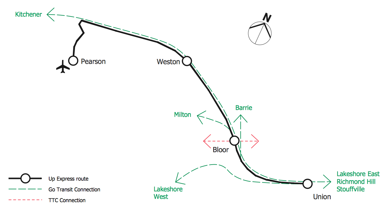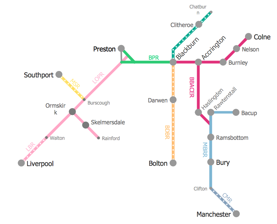 This diagram was created in ConceptDraw DIAGRAM using the Transport Map Library from the Metro Map Solution. An experienced user spent 40 minutes creating this sample.