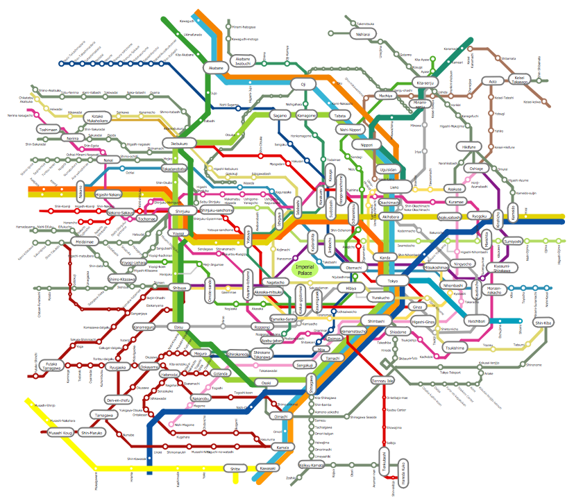 This sample illustrates the most extensive mass transit system in the world — Tokyo Tube Map. Look at this subway map – it has an extremely complex structure. Use the predesigned vector objects from the ConceptDraw DIAGRAM libraries to design similarly complex routes and metro maps, metro path maps, subway train maps, and metro train maps in mere minutes.