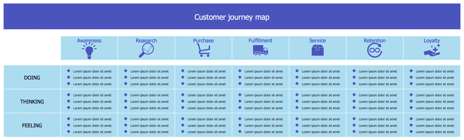 There are a few samples that you see on this page which were created in the ConceptDraw DIAGRAM application by using the Customer Journey Mapping solution. Some of the solution's capabilities as well as the professional results which you can achieve are all demonstrated here on this page.