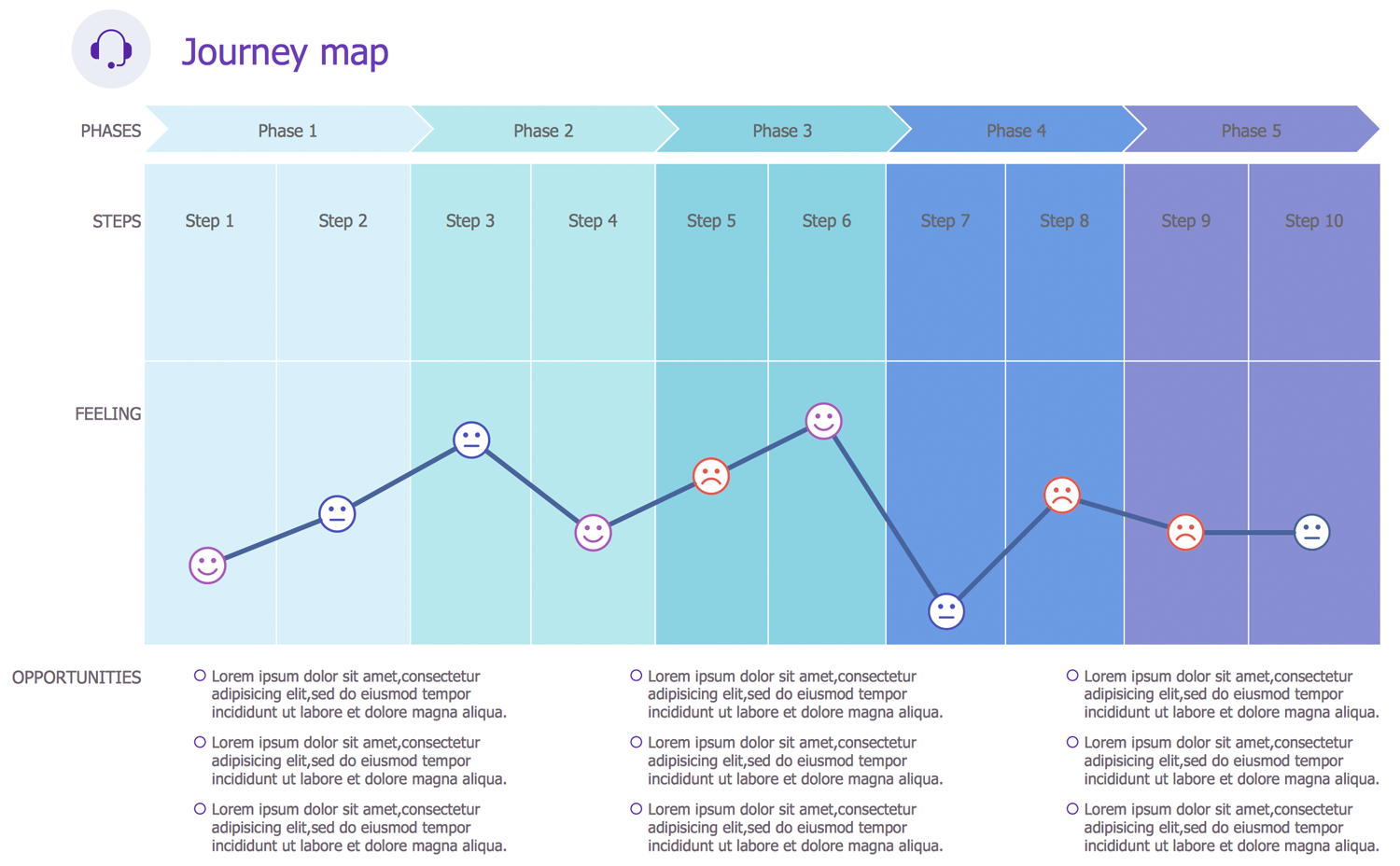 This Customer journey map template was designed in ConceptDraw DIAGRAM software in a result of applying the Customer Journey Mapping solution tools and taking as the base the illustration for the "Journey Mapping Our Customer Experience" post at the USA.gov blog. We have several phases and the steps corresponding to them, the curve with marked feelings at the key points, and also listed opportunities. The journey mapping process allowed to identify the gaps in customer’s experience and the pain points, so to analyze the results, to make conclusions, to evaluate the situation, to prioritize areas for improvement, to understand better the employees, and finally to undertake actions for elimination the identified deficiencies. It's an exciting idea to mark key points with emoticons and to divide with color shades the steps belonging to different phases. Try to create your own Customer journey map basing on this CJM template and you will ascertain how easy is its creation.