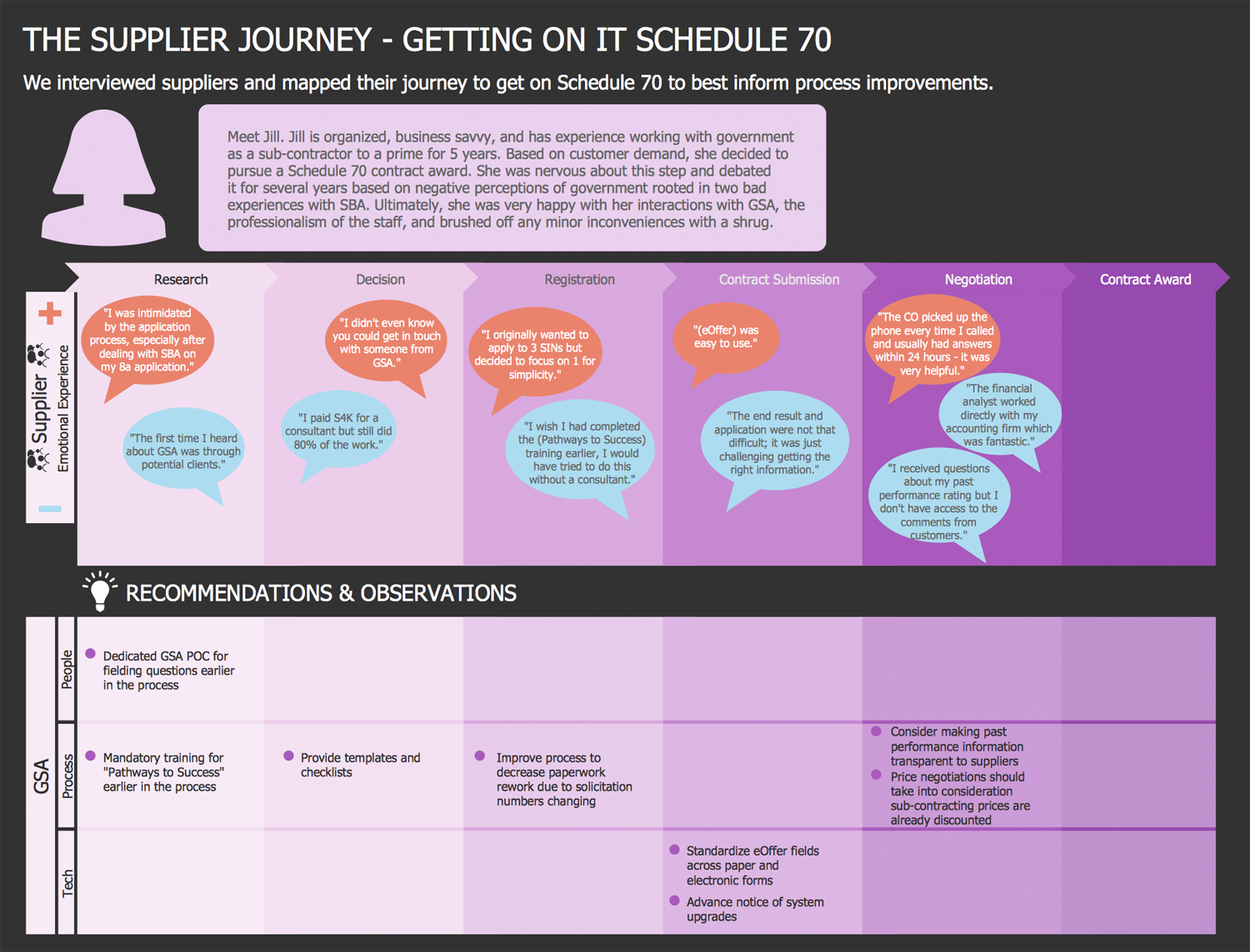 This sample represents the Supplier journey map, which was designed basing on the illustration for the "CX Day in government: How we all shape the customer journey" post placed at the U.S. General Services Administration blog. The Office of Customer Experience is a helper of General Services Administration in creation of an extended map of customer relationships, development and piloting new ideas through the eyes of customers, as well as bringing the business lines closer to the customers. This journey was mapped in a result of interviewing suppliers passed by the business specialist Jill. The Schedule 70 contract award allowed to inform in a best way about the process and employees experience improvements, and to develop the Action plans basing on feedbacks. Having the ConceptDraw DIAGRAM software you can realize the journey mapping the most effectively, it is helpful in creation of the customer experience, development the Journey maps and outlining recommendations for different categories.