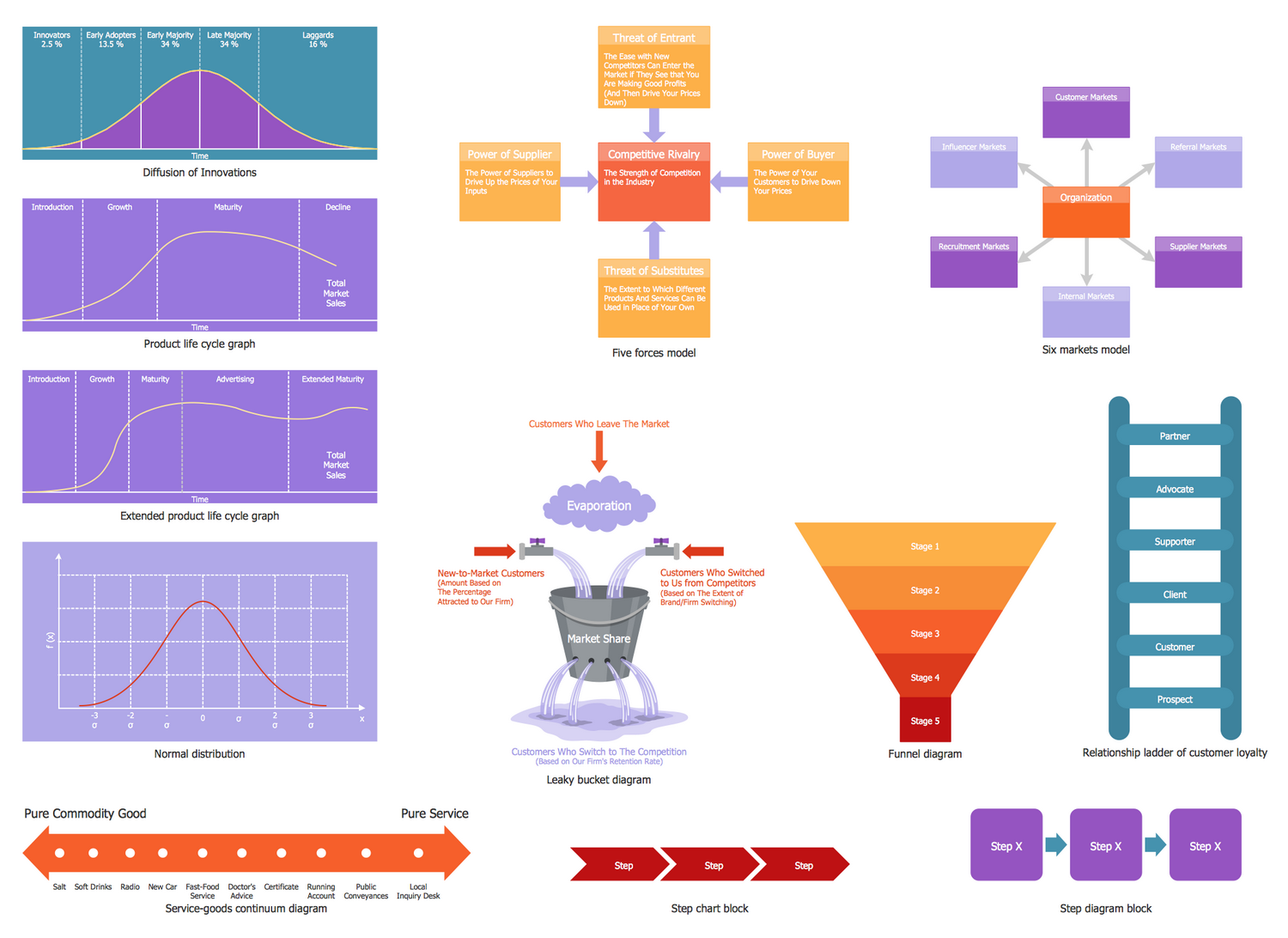 Marketing Diagrams solution extends ConceptDraw DIAGRAM diagramming software with abundance of samples, templates and vector design elements that are gathered within library and intended for easy graphical visualization and drawing different types of Marketing diagrams and graphs, including Branding Strategies Diagram, Five Forces Model Diagram, Decision Tree Diagram, Puzzle Diagram, Step Diagram, Process Chart, Strategy Map, Funnel Diagram, Value Chain Diagram, Ladder of Customer Loyalty Diagram, Leaky Bucket Diagram, Promotional Mix Diagram, Service-Goods Continuum Diagram, Six Markets Model Diagram, Sources of Customer Satisfaction Diagram, etc. Analyze effectively the marketing activity of your company and apply the optimal marketing methods with ConceptDraw DIAGRAM software.