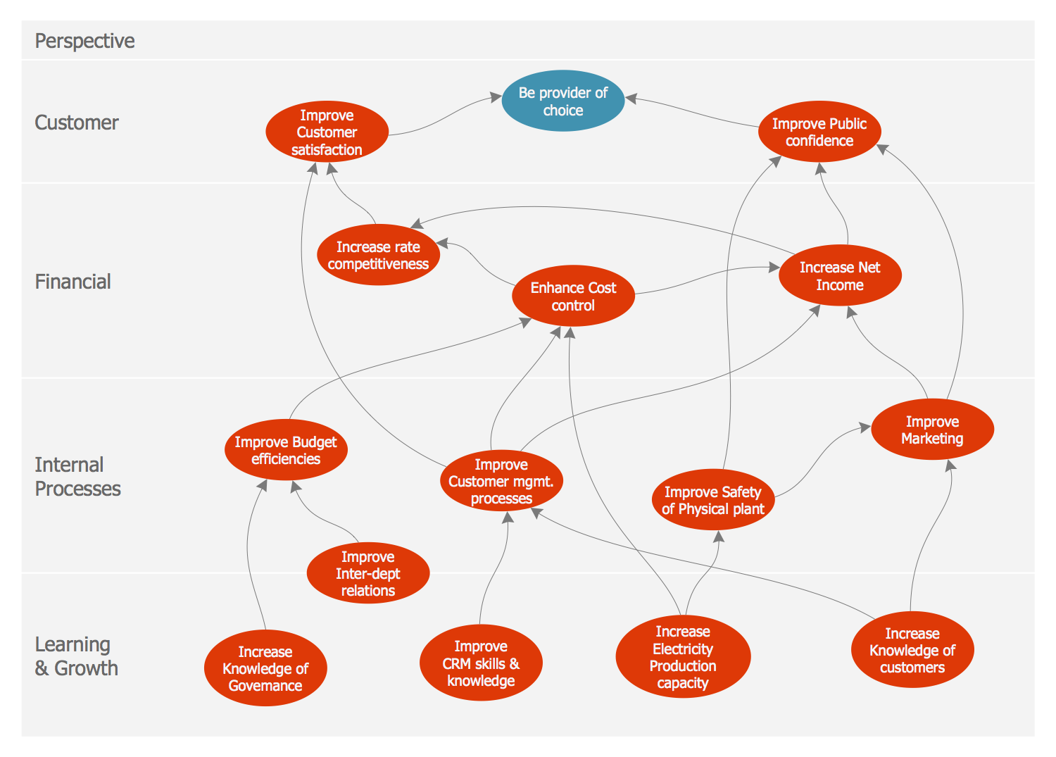 This sample shows the Balanced scorecard strategy map. It is a good example of Strategy map, which is a type of diagram used to document in a visual view the primary strategic goals that are pursued by an organization or a management team. They are commonly-used elements of documentation associated with the balanced scorecard. The Strategy map usually has a simple view, includes less than 20 objectives, which are represented as ovals on the map and arrayed across two or more horizontal bands representing the perspectives, and finally the objectives are connected with arrows that depict the causal relationships. The ConceptDraw DIAGRAM software gives you a freedom of choice – you can design your Strategy map in a strict or free form, you can differ the color filling or color intensity of map’s elements according to your taste or documentation design requirements, and finally you can resize the elements without loss of quality by slightly movement.