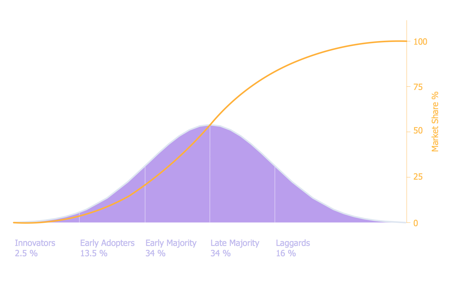 This sample diagram shows the Diffusion of Innovations (DOI) graph visually illustrating the diffusion of innovations theory. Diffusion is a process of transmission the innovations through the channels over time among the members of a certain social system. Diffusion of Innovations is a theory of Everett Rogers, which is based on the concept that there are four basic elements influencing the spread of new technologies and new ideas, these are: innovations, communication channels, time, and social system. This theory helps to explain how, why, and at what rate these new ideas and technologies spread in different cultures and fields, because it largely depends from the human capital, the type of adopters, the innovation-decision process, and expresses differently in various cultures. This graph visually displays the groups of consumers adopting the new technology. You can see the percentage distribution of following adopters' categories: Innovators, Early Adopters, Early Majority, Late Majority, and Laggards.