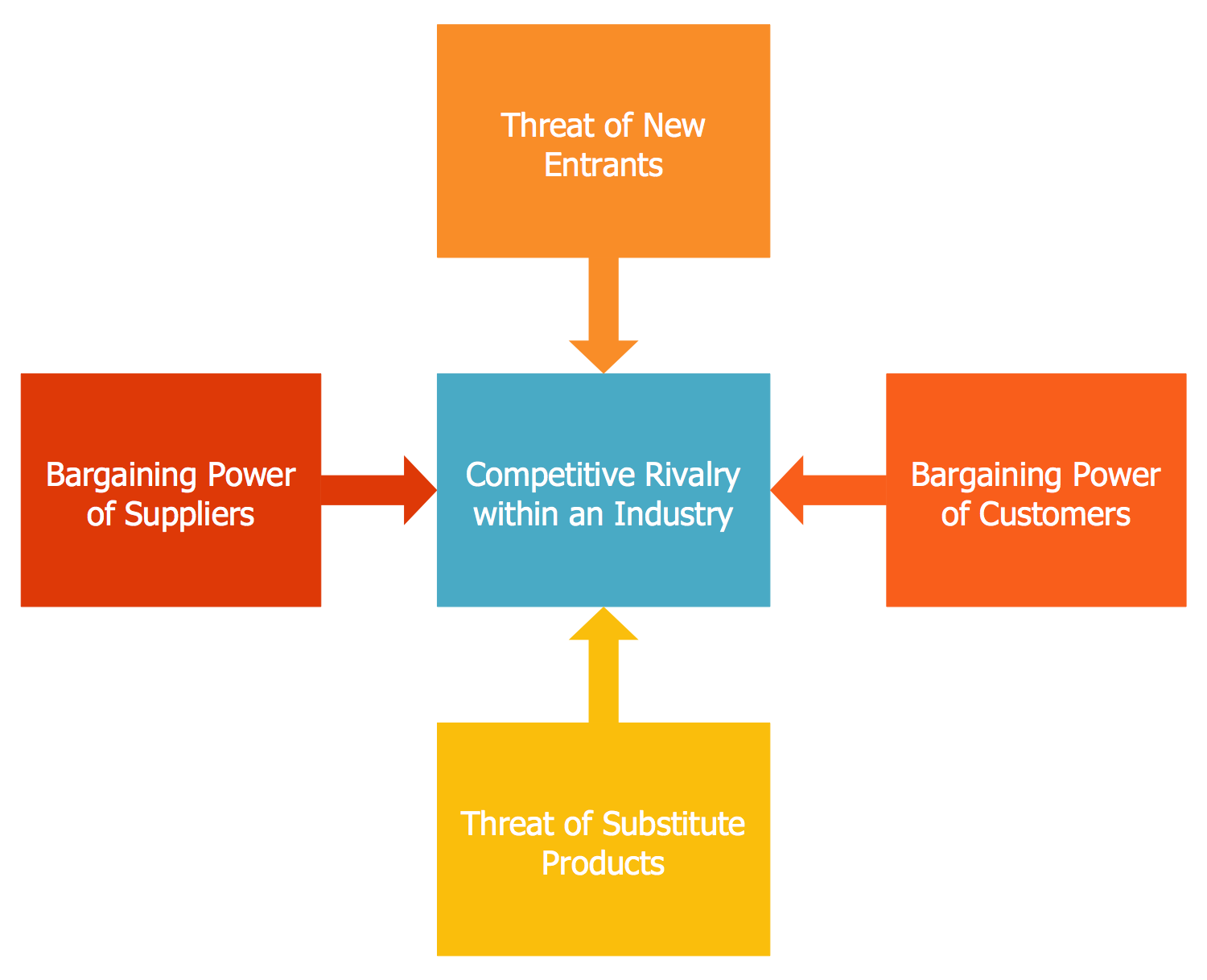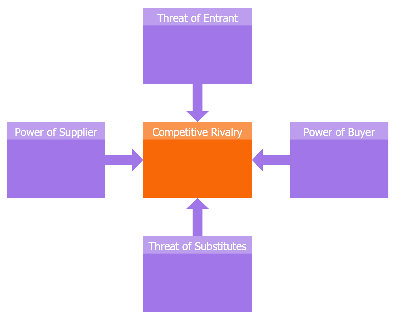 This sample represents the graphical view of the Porter's Five Forces Model that is the canon for modern business strategy development and industry analysis. It is named so in honor of economist Michael E. Porter, who developed and published it in his "Competitive strategy" book in 1979. The competition is an accumulation of the main forces influencing the company's economic viability. The essence of the Porter's theory is a differentiation of competitive forces and analysis of individual indicators. Porter's five forces model identifies five key factors crucial for a competition in the industry, these are: Power of supplier, Threat of Entrant, Power of buyer, Threat of Substitutes, and Competitive Rivalry. Three of them are the factors from the horizontal competition and two forces are from vertical competition. All these factors you can observe on a given diagram. It’s very useful and convenient to design different Marketing diagrams using the predesigned objects from the ConceptDraw DIAGRAM solutions libraries.