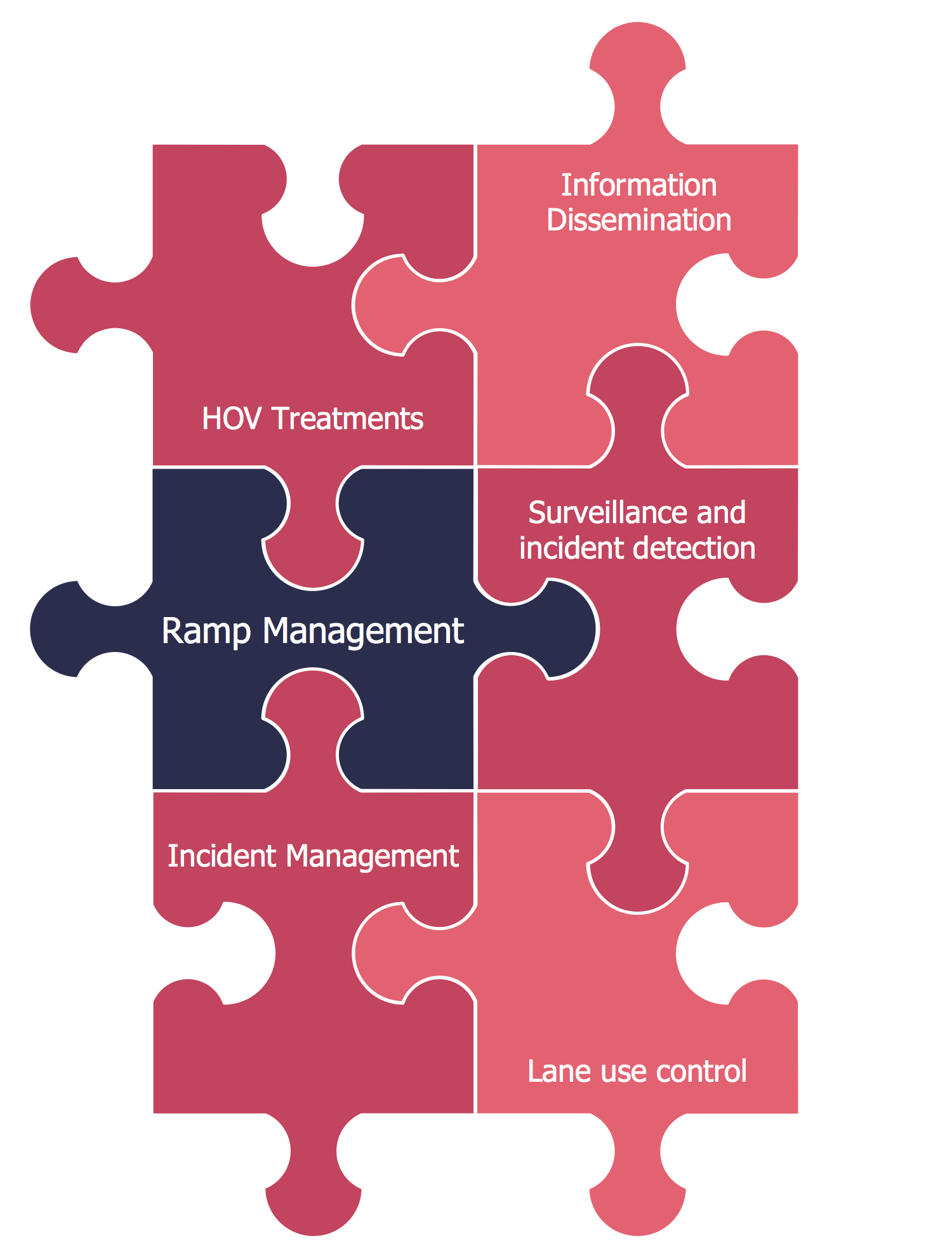 This Marketing diagram example represents the Puzzle diagram. It was redesigned from the "Ramp Management and Control" webpage of US Department of Transportation Federal Highway Administration website. The central Ramp Management puzzle object is surrounded with five puzzles: HOV treatments, Information dissemination, Ramp management, Surveillance and incident detection, Incident management, Lane use control. The ramp management is the application of varied control devices, such as the traffic signals, gates, signing to control and to regulate the quantity of vehicles entering and leaving a freeway, with a goal of observance the operational objectives. There are generally accepted four strategies of managing the ramp-based traffic: ramp metering, ramp closure, special use treatments, and ramp terminal treatments. Using the ConceptDraw's puzzle elements of different forms you can compose varied variants of Puzzle combinations. The puzzle pieces exactly match one to another, you need only choose desired ones, drag to your document and dock them.