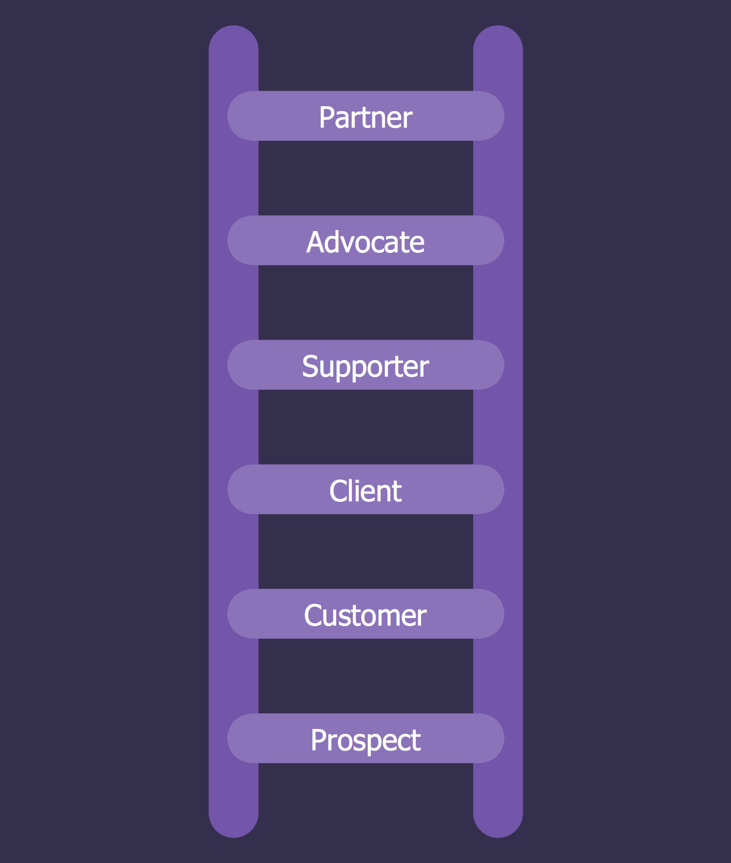 This Marketing diagram shows the relationship ladder of customer loyalty. Made with help of ready vector object from the Marketing Diagrams library, it represents the following groups of customers formed according to the level of loyalty: Prospect (a human that going to buy a product, but have not purchased it), Customer, Client, Supporter, Advocate, and Partner. The relationship marketing is an actively developed form of marketing defined as a direct response marketing campaign focused on the customer retention and satisfaction instead the dominant focus on sales transactions, i.e. relationship marketing supports the value of long term relationships with customers, which are usually decisive factor of competitiveness. It extends the communication far outside the obsessive promotional messages and seeks to establish tight economic, technical and social relationships with partners, which let to increase the values of commercial activity on the market, to decrease the transaction costs and to save the enterprise resources.
