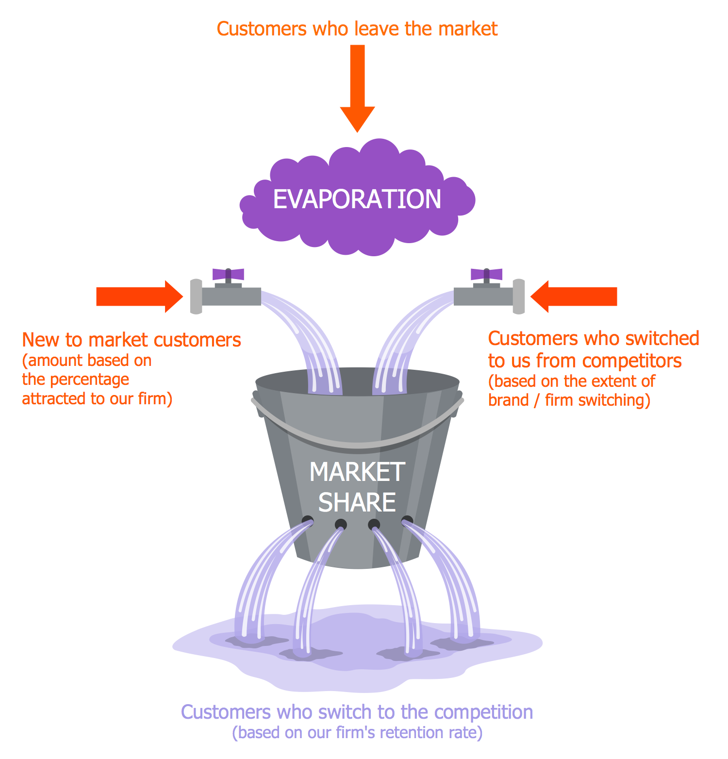 This sample shows the Leaky Bucket Algorithm that is widely used in the field of packet-switched computer networks and telecommunications networks. This one and other professional looking diagrams, created in ConceptDraw DIAGRAM can be used at the presentations, conferences, and various publications. They attract attention and are easy to remember. As for the leaky bucket theory, it is a simple model that is used to describe the process of gaining and losing clients. This theory assists in definition the customer attrition rates and in making customer attrition analysis. One of the key terms of relationship marketing and the main goal of each market and each company is retention of existing customers and attraction of new ones, at this it is well known that retaining of existing customer is easier and less expensive that acquiring the new. But there are also those companies, which vice versa are concentrated on the involvement new customers.