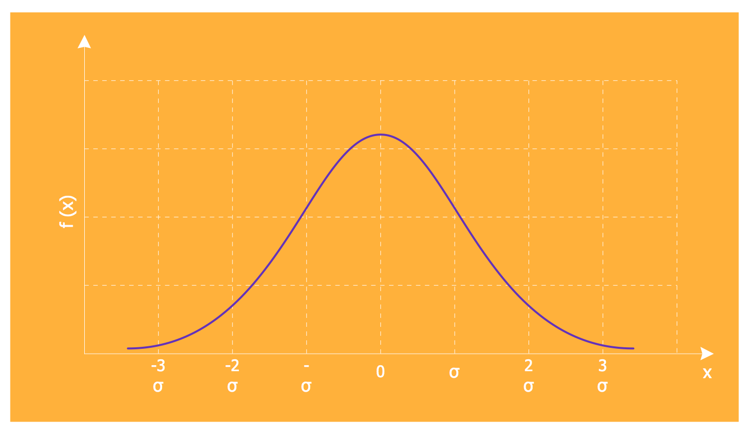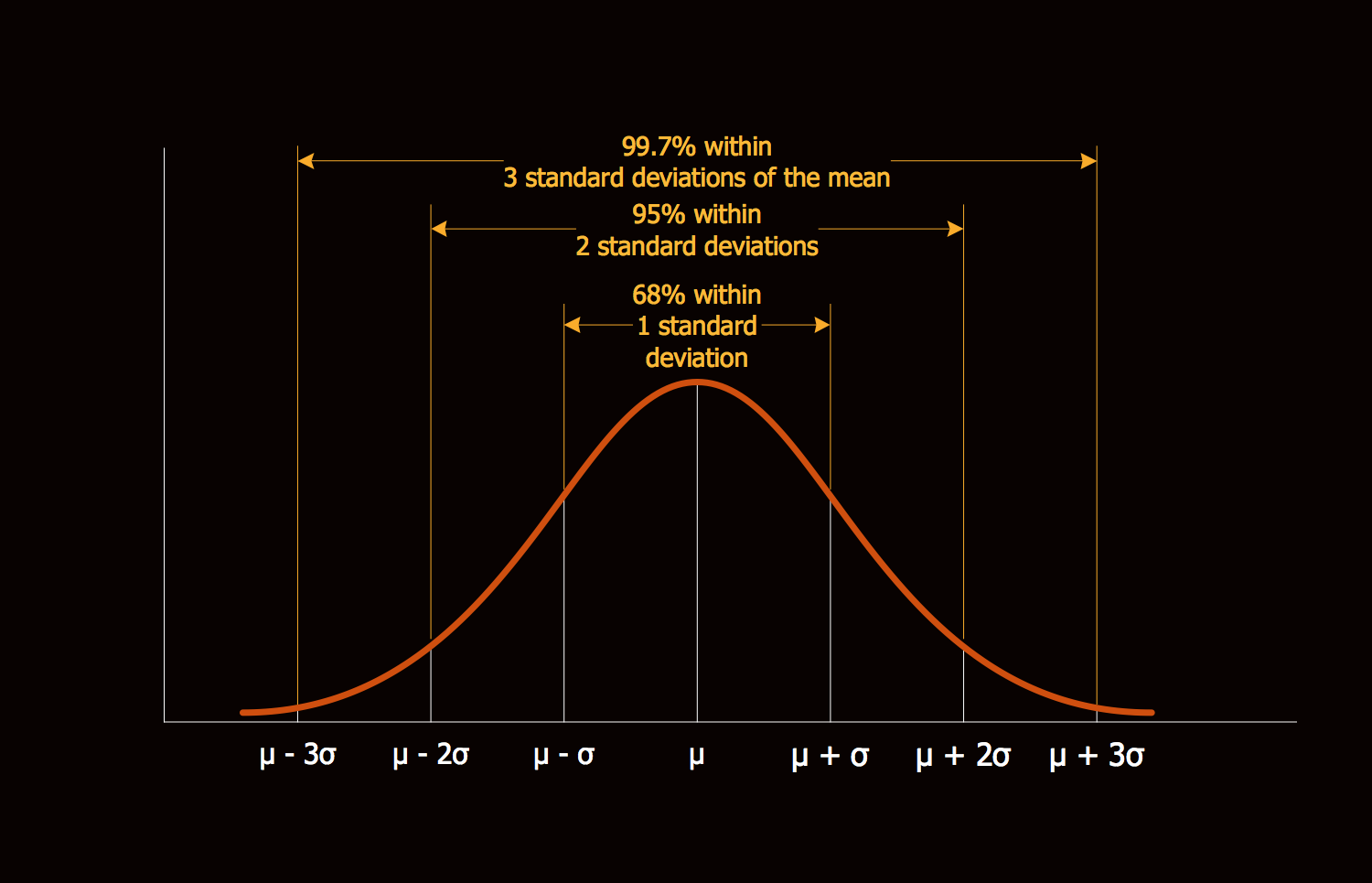 This Marketing diagram sample shows the graph of univariate normal or Gaussian distribution that is the most common type of distribution. In 1733, it was first discovered by Moivre. Sometimes, this graph is called a bell curve. The Gaussian distribution plays important role in data analysis, in analysis of measurement errors, at the control of technological processes and regimes, in analysis and forecasting of different phenomena in the probability theory, mathematical statistics, statistical physics, biology, medicine, and other areas of knowledge. If the result of some observation is the sum of many weakly interdependent random variables, each of which makes a small contribution relatively to the total amount, then increasing the number of components, the distribution of centered and normalized result will tend to the normal. The main feature of the normal distribution is that it is limiting, to which approximate other distributions, and only continuous random variables comply with him.