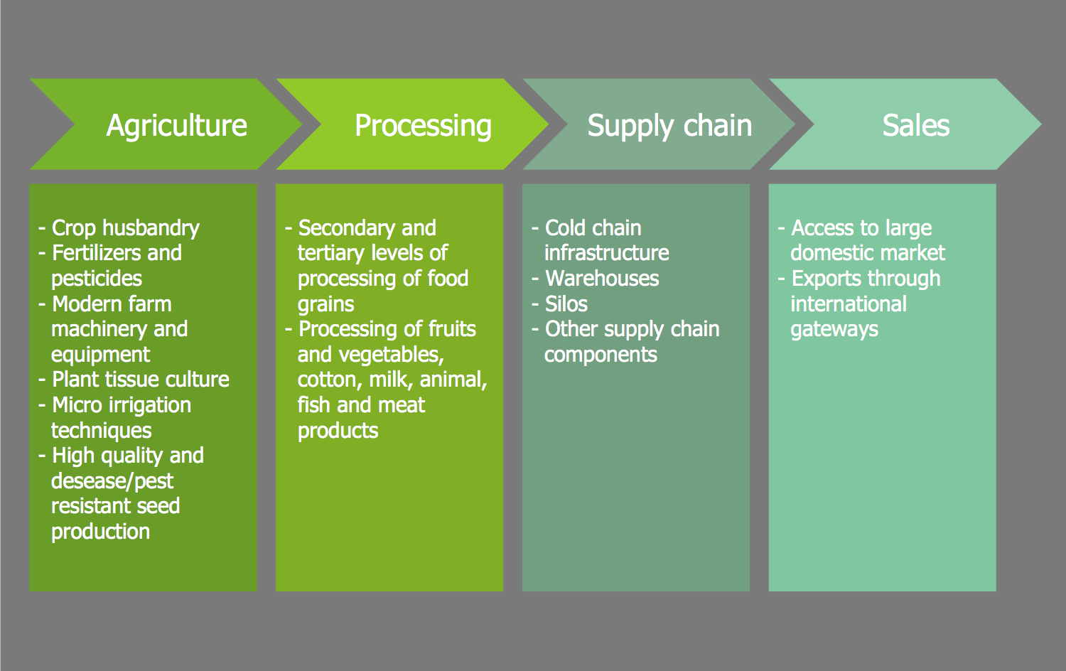 This diagram sample created on the base of webpage from the Invest Punjab website. India has highly advanced agriculture and is one of the largest producers of milk, fruits, coconuts and cashew nuts, pulses, tea, and food grain production in a world. This diagram illustrates opportunities and the main steps in agriculture and food processing in India's Punjab. Agriculture and agri-food manufacturing are developed from the ancient times, but the modern opportunities and trends gave even greater development for these areas. Agro industry covers a wide range of activities with utilization of farm, animal and forestry based products as raw materials for manufacturing different products. This Step diagram is composed from the ready-to-use step chart blocks offered by the Marketing Diagrams library. So, you can see four steps on this diagram: Agriculture, Processing, Supply Chain, and Sales, under which is listed the corresponding detailed information. Moreover, all steps are brightly highlighted with red, but if you need, you can change accents according to your taste.