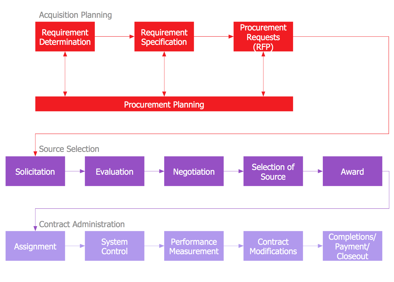 This Process Chart sample shows the Contracting process line. The contract administration or the contract management is a process of systematical and efficient management the contracts, which are made with all variety of stakeholders, such as customers, vendors, partners, employees, on all stages from the planning, creation, execution, and also analysis with purpose of minimization risks and maximization financial and operational performance. The contract management process includes the negotiation and approval of the contracts' terms and conditions, the documenting of the terms and conditions, and ensuring their compliance, as well as correction of any changes and modifications, and making additions that may appear during the contract implementation or execution. On this ConceptDraw diagram at the chain of steps are allocated three stages and highlighted with different colors: Acquisition Planning, Source Selection, and Contract Administration. It is effective to use a way of a visual differentiation the information with some favorite colors.