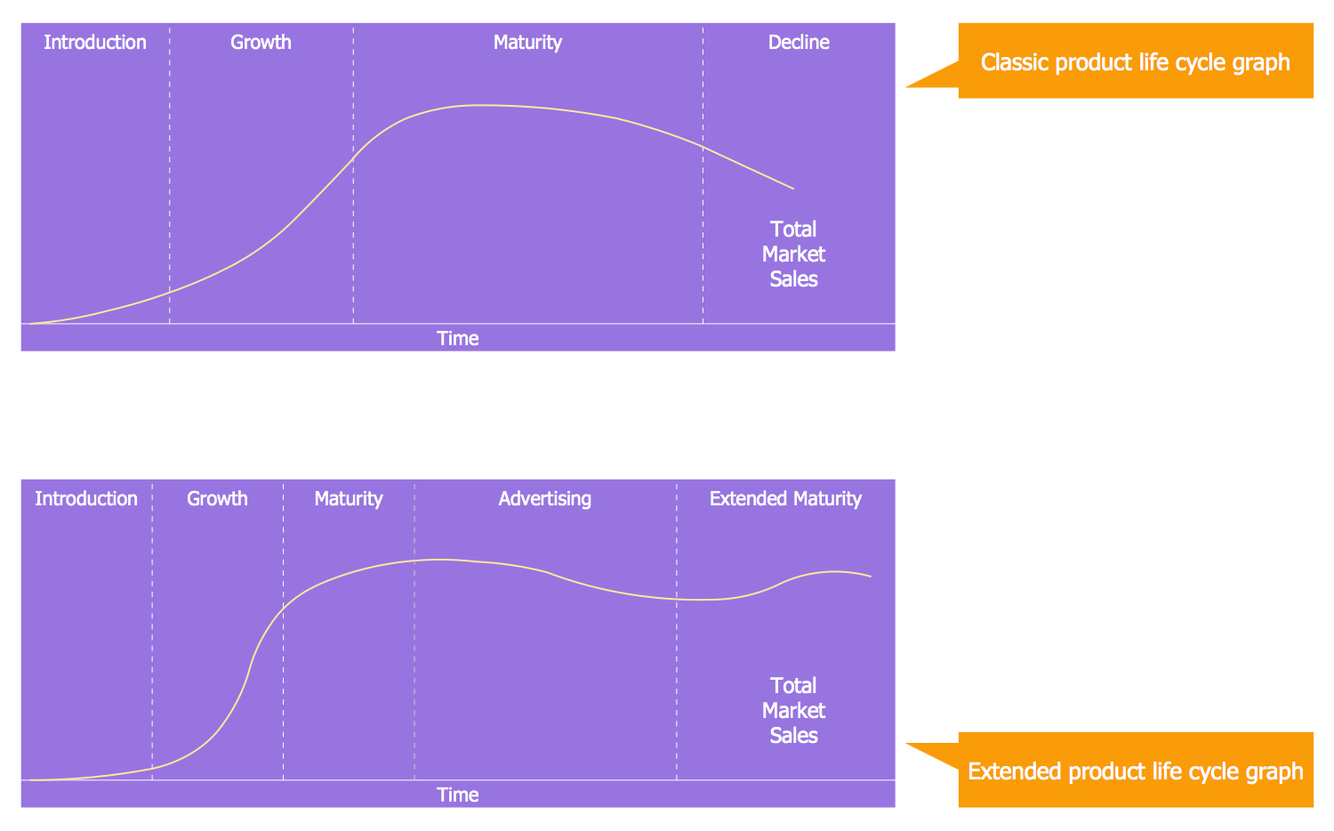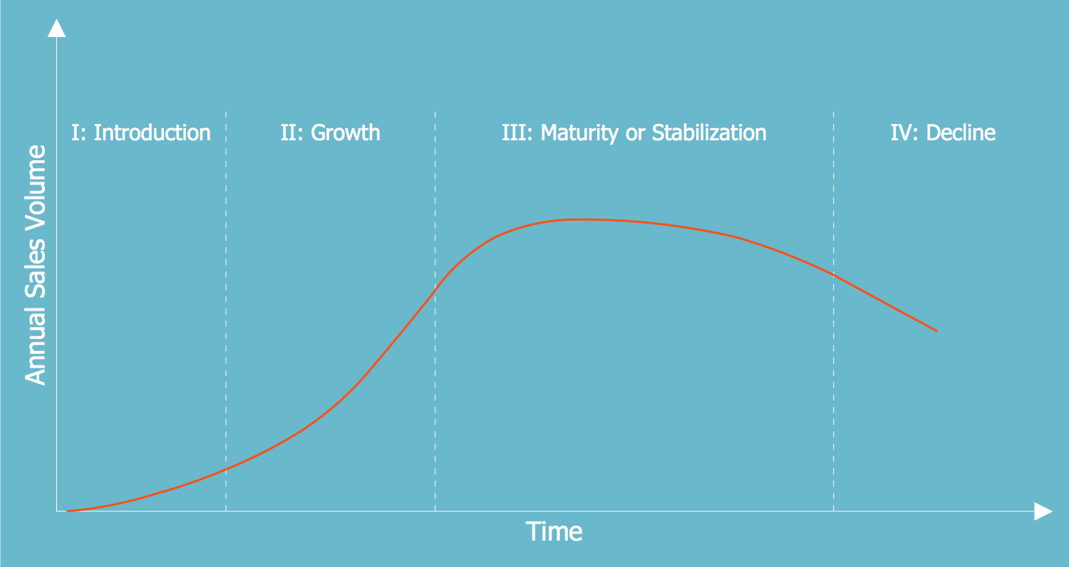 This Marketing diagram example illustrates the Product Life Cycle Graph. The Product life cycle (PLC) is one of the fundamental marketing terms. It is a business analysis with a goal of definition the set of common stages at the life of different commercial products. It is visualized on paper or at the electronic form on computer screen with help of graph or a curve that depicts the progress of a new product and the product's life duration via the sequence of four stages, among which are the introduction, growth, maturity, and decline. This sequence of stages of a product's life cycle is directly connected with changes in marketing situation, which influence on the marketing strategy and marketing mix. The graphs are often much useful than strict numbers, it is enough one glance on the graph to see the product life cycle development, the progress or decline, the product revenue and profits, and other information.