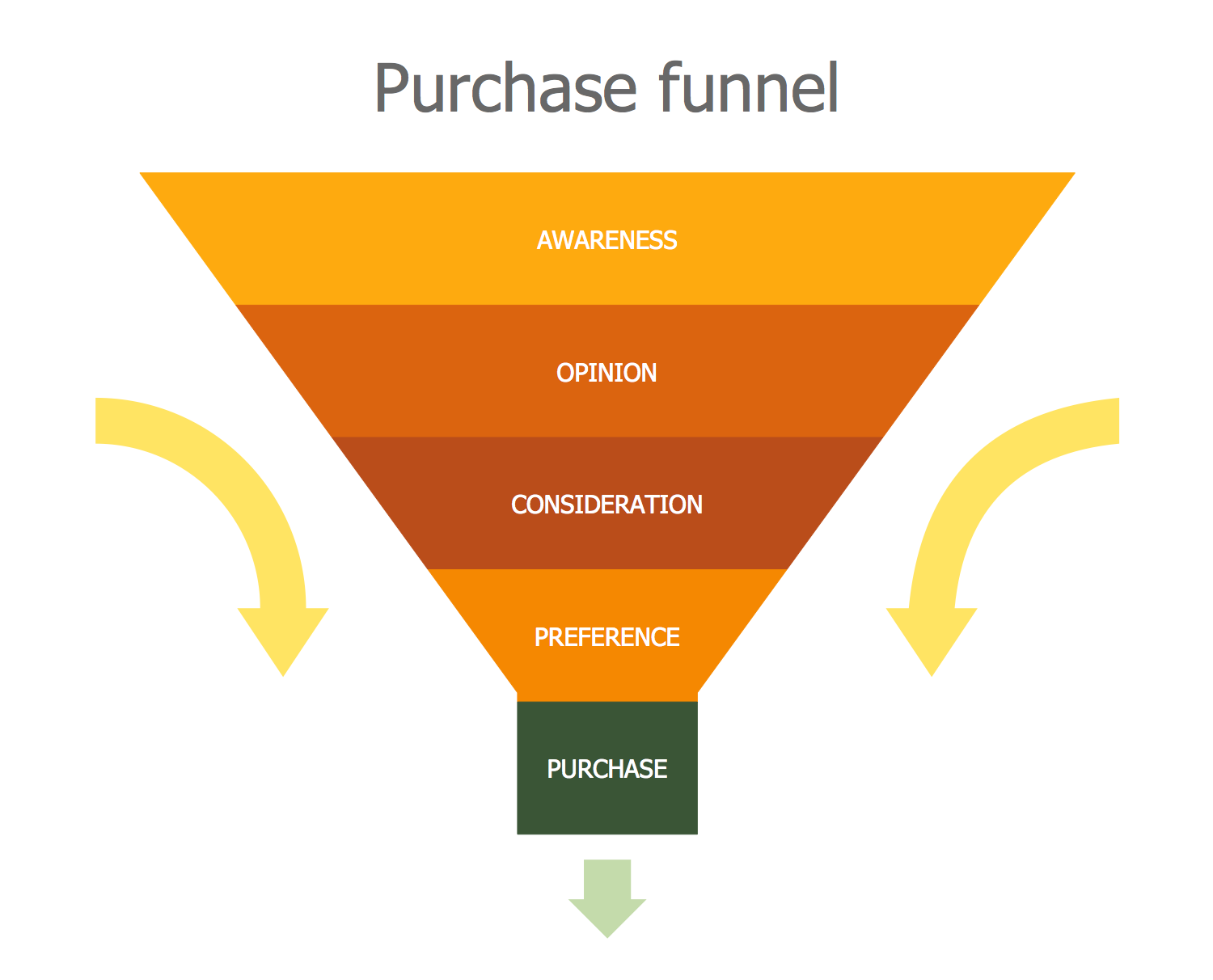 This Marketing sample represents the Funnel diagram, which contains 5 stages of a purchase funnel: Awareness, Opinion, Consideration, Preference, Purchase. The general definition says that the purchase funnel is a marketing model focused on the consumer and illustrating the customer's way from the proposition towards the purchase of some product or service. This term is popular and has a lot of synonyms: purchasing funnel, customer funnel, sales funnel, sales pipeline, marketing funnel, or conversion funnel. It is actively used in marketing and customer relationship management, in guiding the promotional, management and marketing campaigns. In conditions of large offer the different types of products on the modern market and high competition, it is often quite difficult to attract the customers. In this situation can help a correctly constructed purchase funnel, which assists the businesses in efficient work, increasing sales and profits of commercial projects, and sufficiently effective influencing on potential customers.