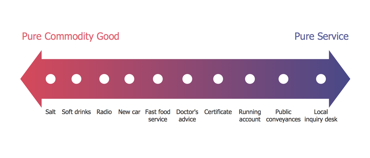 This Marketing diagram sample demonstrates the service-goods continuum. At the left endpoint is placed the pure commodity good and pure service at the other side. However, division of consumables into the physical goods and services is not always correct. There are many companies at the market, which provide exclusively services and there are also other enterprises, which deliver for consumers only the physical goods. But at the same time, there is large quantity of products situated between these two extremes. For example, if we will talk about cafes, restaurants, shopping malls, kids entertainment centers, and many other similar places, you can observe that together with physical goods, such as prepared food or any other goods, you receive also comfortable atmosphere, cleanliness, heat, Wi-Fi, and many other automatically included services, and vice versa. Thus, these two categories are often closely intertwined between each other. Usually the goods can be returned, while delivered services cannot.