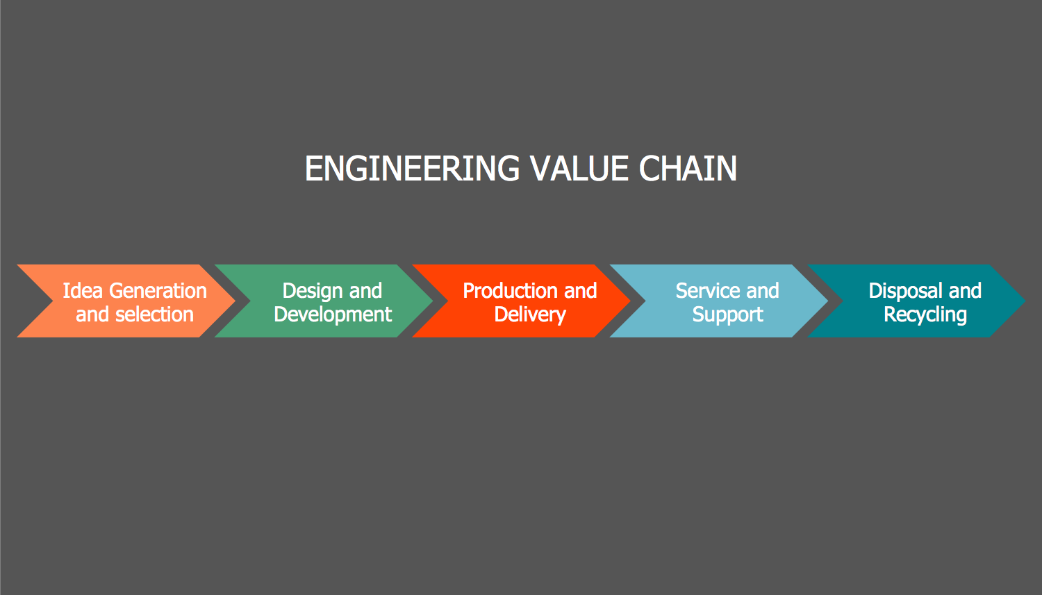 This Step chart sample represents the engineering value chain (EVC) that is the tool of strategic analysis, focused on the detailed studying the organization's activity and potential sources providing the greatest value to consumers with purpose of strategic planning and identification the synergism effects. The idea of a value chain was first suggested by Michael Porter to identify the sources of competitive advantage. A value chain includes as the chain elements all activities of an organization, aimed at the creation the value for consumers. On this chart, you can see the classic model of organization these activities, which includes the following five steps: idea generation and selection, design and development, production and delivery, service and support, disposal and recycling. All these listed steps are represented one after another on the offered diagram using the predesigned ConceptDraw's vector step blocks from the Marketing Diagrams solution libraries. For additional visuality, each step block is colored inimitably.