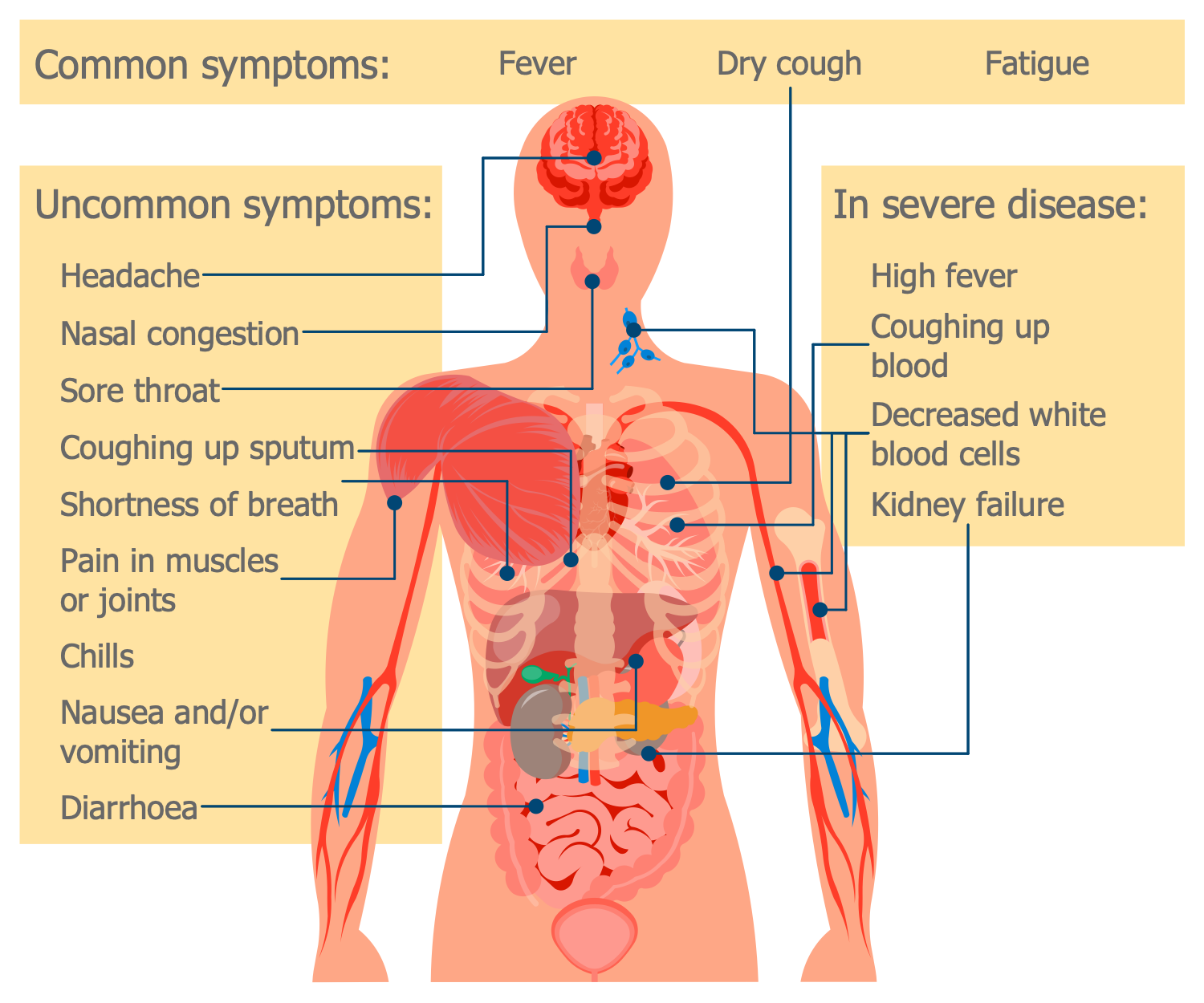 COVID-19 or Coronavirus disease 2019 is an infectious disease first identified in December 2019 in Wuhan, China. It was caused by severe acute respiratory syndrome coronavirus 2 (SARS-CoV-2) and resulted the worldwide pandemic. The symptoms of COVID-19 are listed in this visual sample. Among the most common are fever, dry cough, and fatigue. However were also noticed some uncommon symptoms, like headache, nasal congestion, sore throat, coughing up sputum, shortness of breath, pain in muscles or joints, chills, nausea and/or vomiting, diarrhea (diarrhoea). The disease may proceed with different degrees of gravity, in severe disease cases were fixed high fever, coughing up blood, decreased white blood cells, and kidney failure. The use of clipart representing a human's internal structure allows reflecting the correspondence of specific symptoms to the organs where they occur. This diagram clearly explains all the symptoms of CoV and is easy to understand, so it is ideal for informing people, it can be used to immediately identify a disease and make a correct diagnosis.