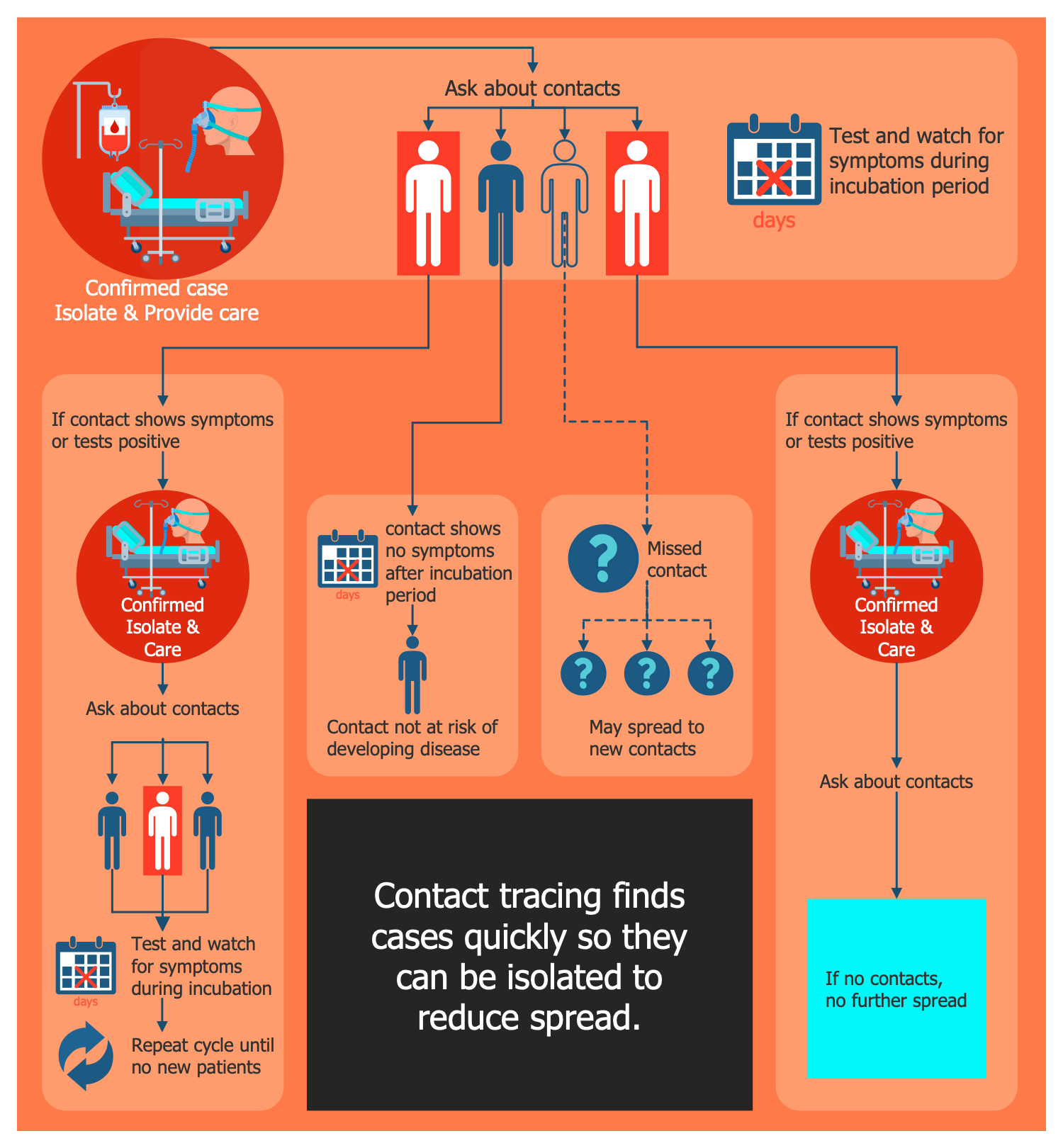 This sample diagram is dedicated to tracing the contacts of a person with confirmed disease. The goal of this activity is to stop the spread of a disease by finding people that have recently been in contact with an infected person, testing them for infection, as well as isolating, monitoring them for symptoms during the incubation period, and simultaneously treating the infected ones. If contact symptoms were discovered among the contacts of the infected person, then, in turn, tracking of the contacts of the new patient begins and this cycle is repeated until there are no new patients and no contacts with other people. And correspondingly at this moment, the further spread of disease will stop. Contact tracing is typically used for diseases such as tuberculosis, measles, blood and sexually transmitted infections, serious bacterial infections, and new airborne infections such as H1N1, SARS-CoV, COVID-19.