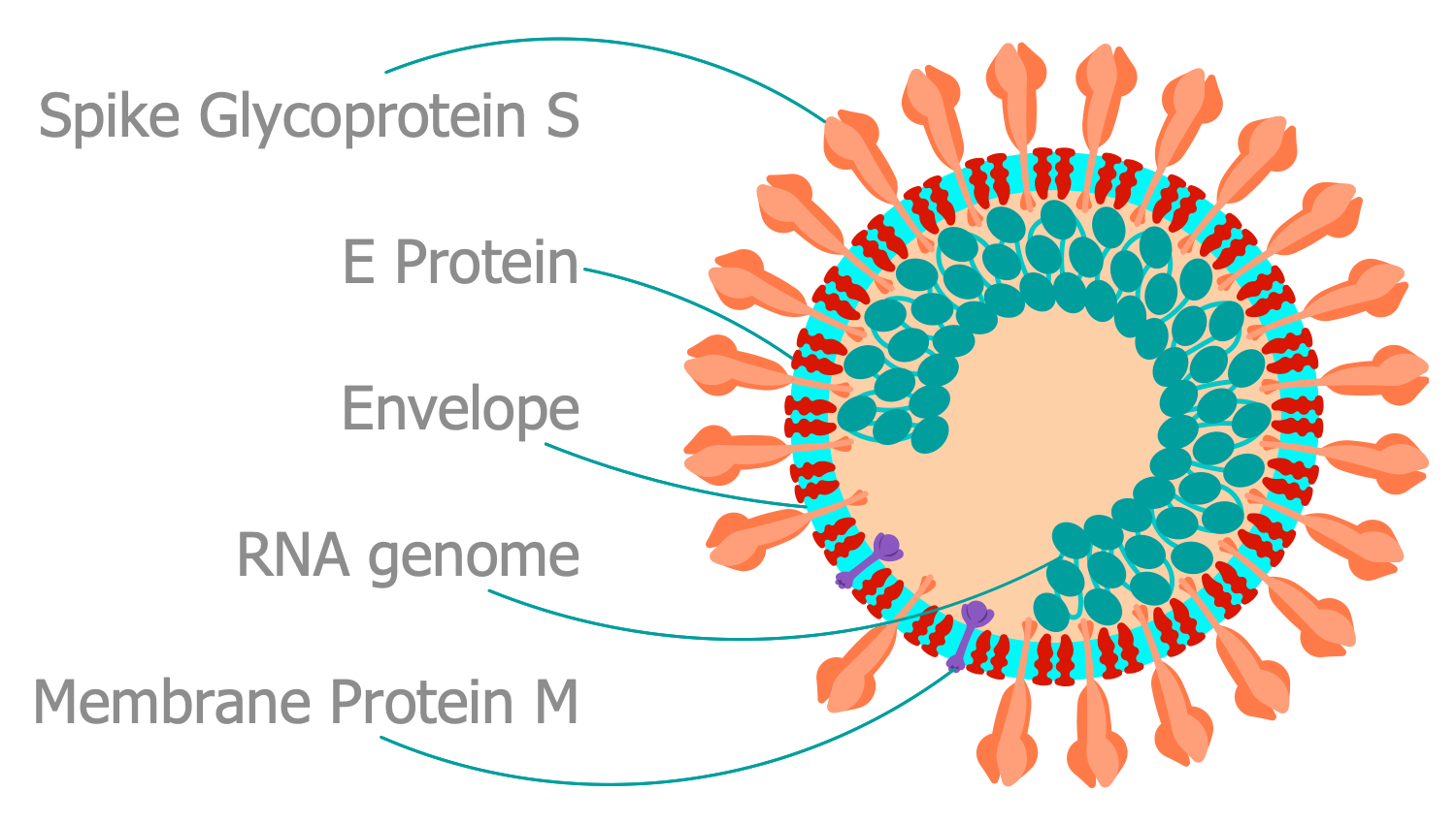 This example was designed based on the Wikimedia Commons file "Coronavirus virion structure.svg" and shows the Coronavirus virion structure. Five structural proteins are encoded by Coronaviruses in their genomes. These are the Spike glycoprotein (S), Envelope protein (E), Membrane protein (M), Hemagglutinin Esterase protein (HE), and Nucleocapsid protein (N), which plays an essential role in the structure of CoV. Most of listed proteins are presented in all virions but Hemagglutinin Esterase is contained only in some beta coronaviruses. The interactions between these proteins allow several virus particles to organize together. Coronaviruses are a group of related RNA viruses, they contain a positive-sense, single-stranded RNA viral genome consisting of seven genes, via interactions with which the replication and transcription of CoV are realized. Coronaviruses bind to the receptors on the host cell surface via the spike proteins, the replication occurs in the cell cytoplasm.