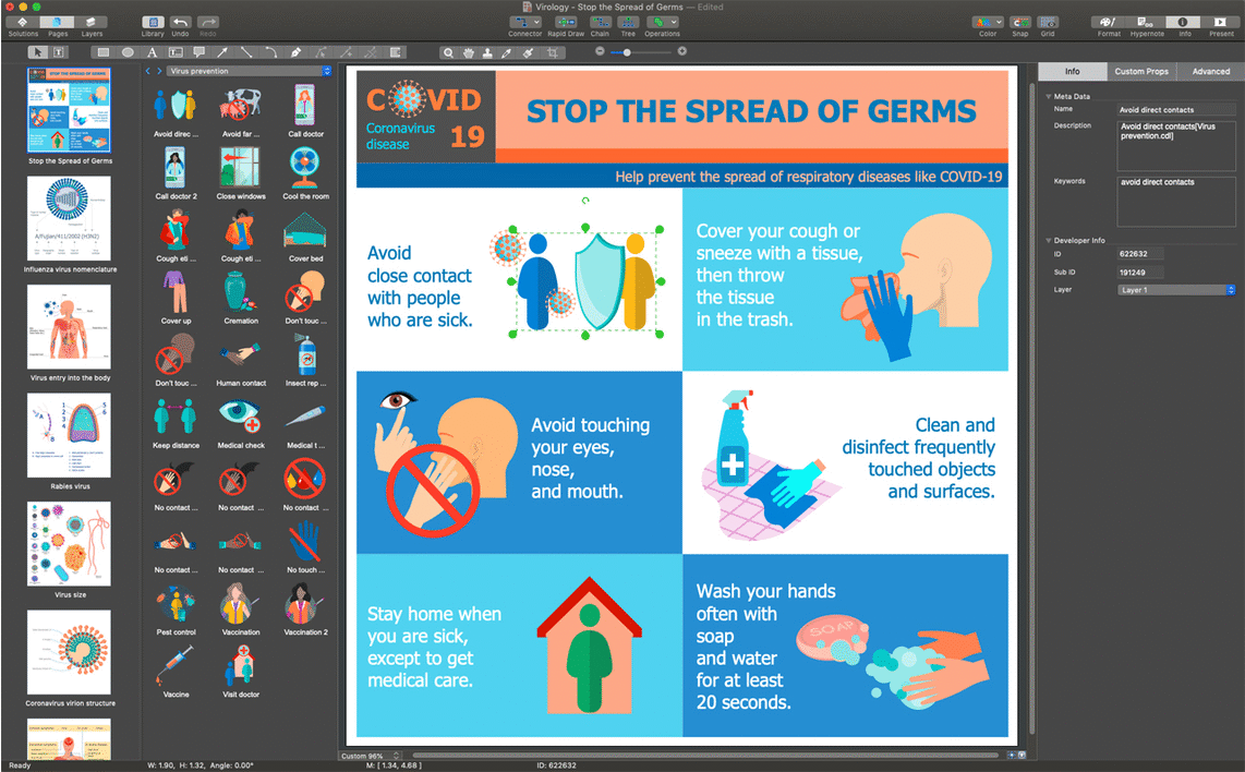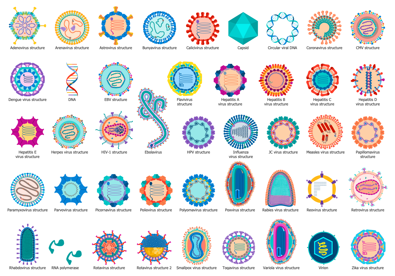 The Medical Virology solution contains 10 examples and 14 libraries containing 420 vector graphics and icons, to allow you to create professional-looking documents.