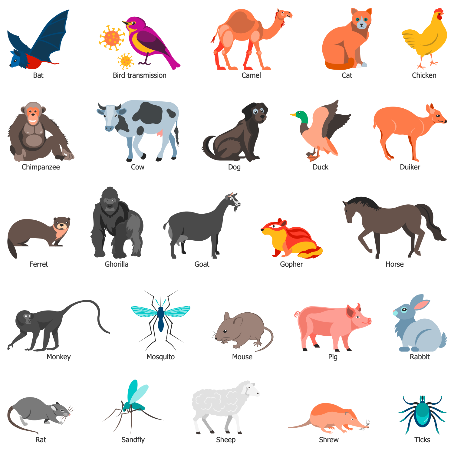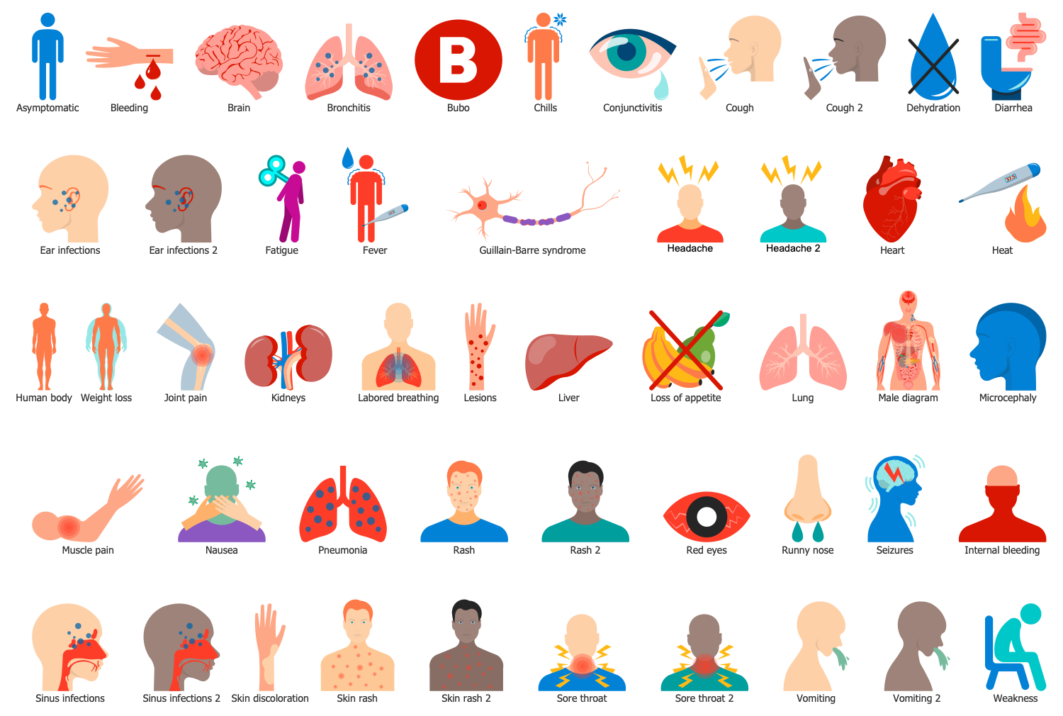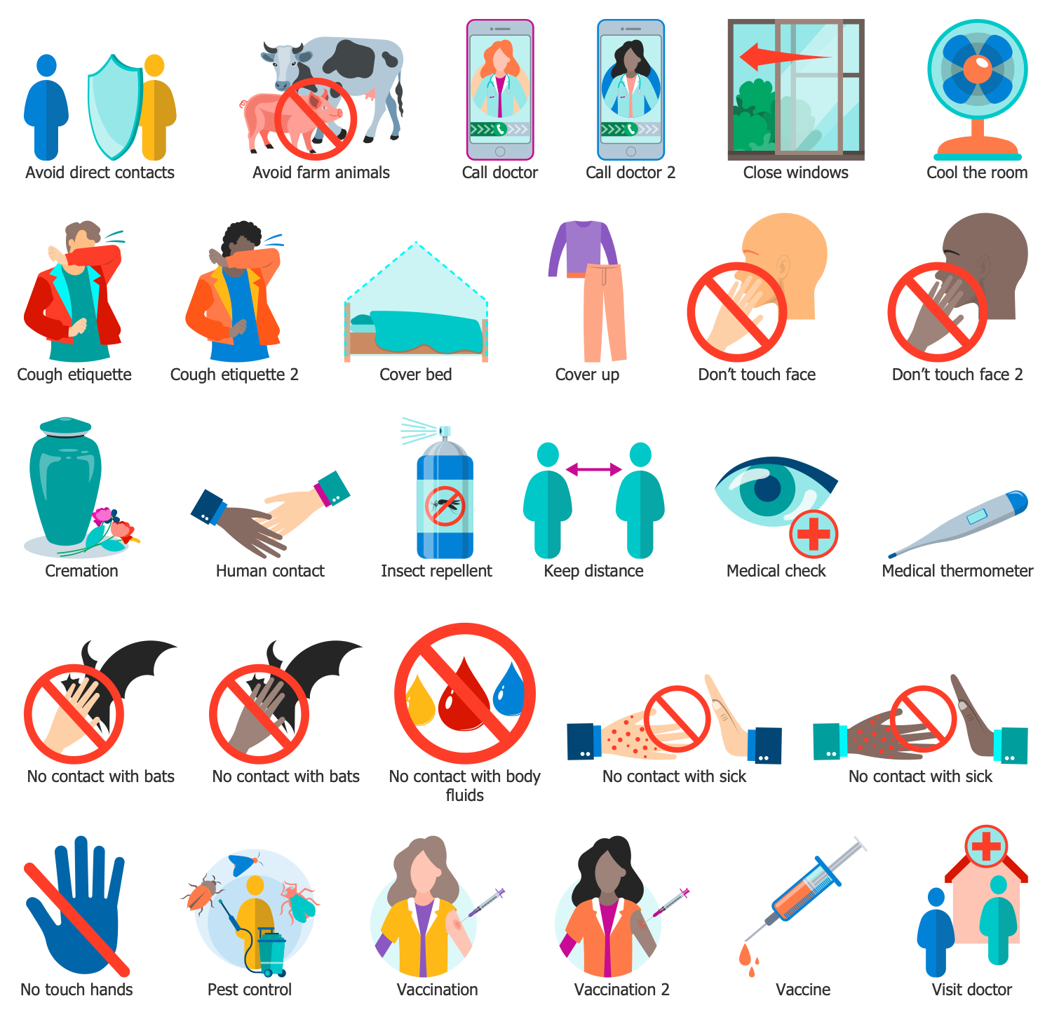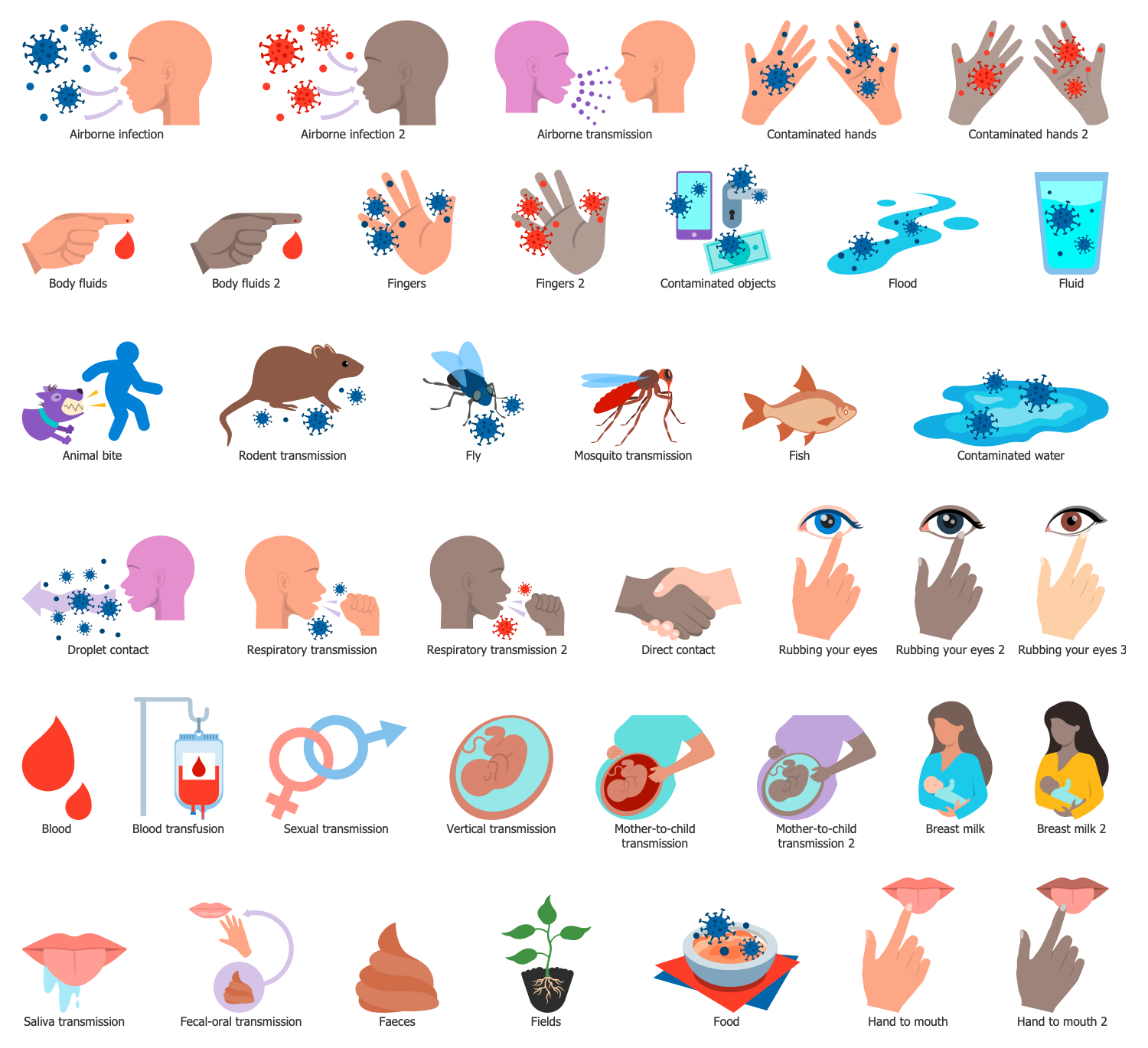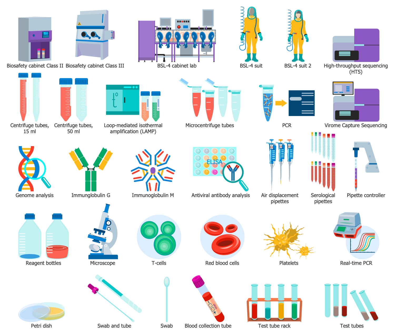 Medical Virology solution extends the functionality of ConceptDraw DIAGRAM with a large collection of medicine and virology vector design objects for designing high-quality illustrations, diagrams, infographics, charts on the medical virology, immunology, healthcare, epidemiology and virus pandemic topics, infection and treatment the viral infection and infectious diseases, vaccination and obtaining herd immunity, presentation slides, web pages and blog posts on microbiology researches, actual virology problems, developing effective vaccines, and immunization. The set of professionally designed samples is included and shows the solution’s power and its ease of use in medical and healthcare illustration design. It is the best solution for medical workers, virologists, microbiologists, immunity specialists, biotechnologists, viruses researchers, medical consultants, professors of medical sciences, lecturers of the medical institutions, health science specialists, marketers in medicine and healthcare field, journalists and editors of medical journals, and other people of medicine-related specialties.