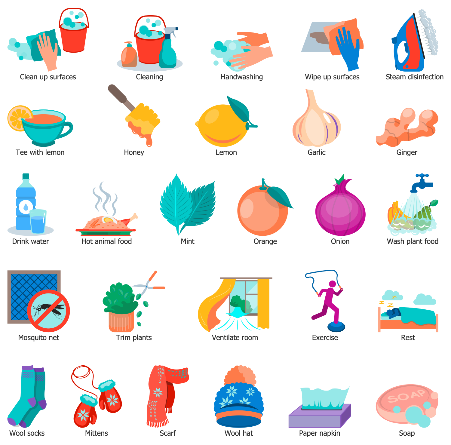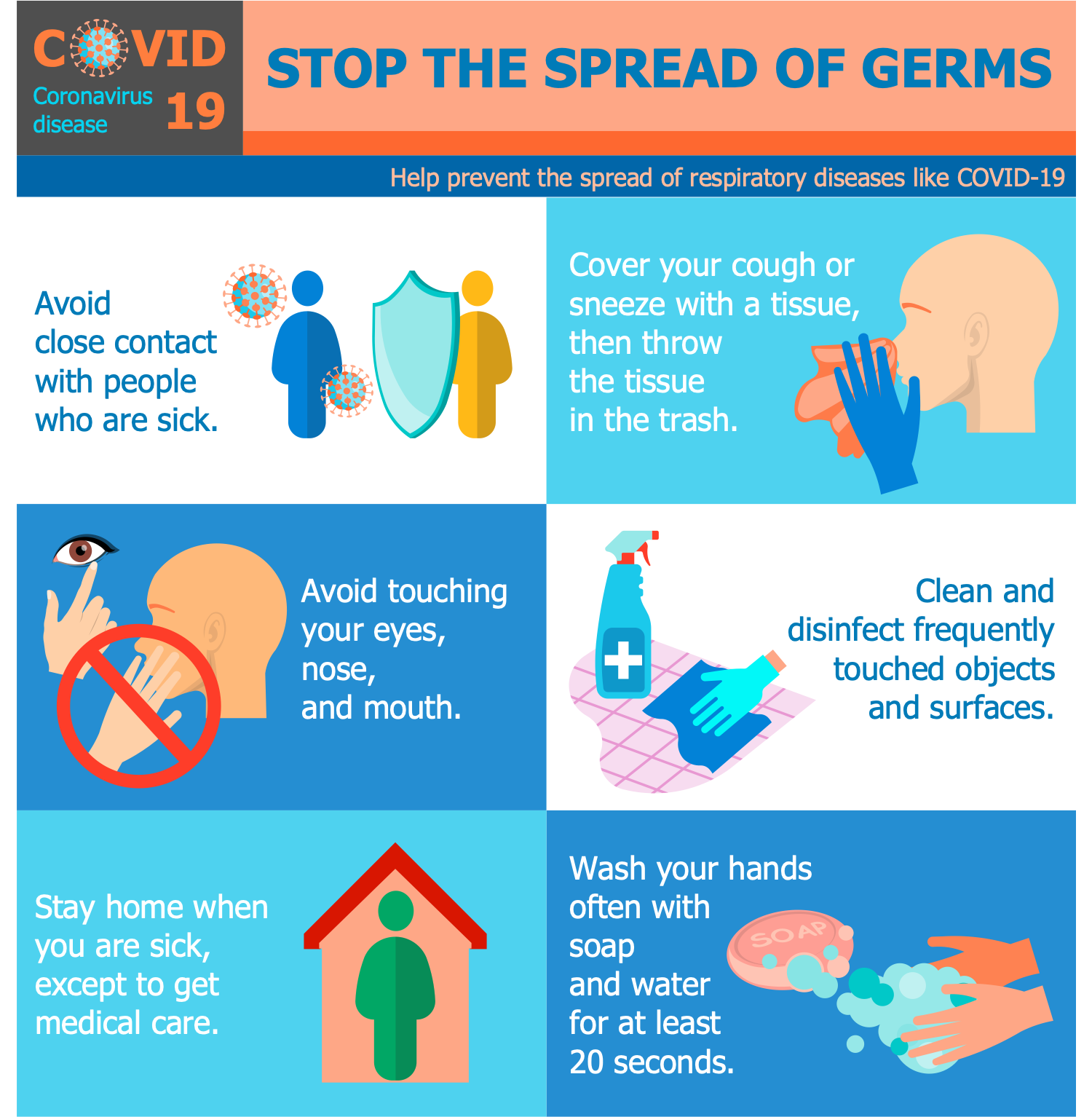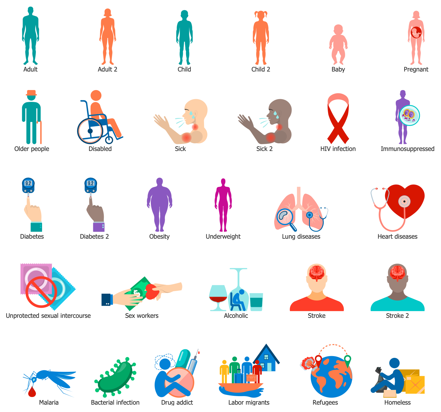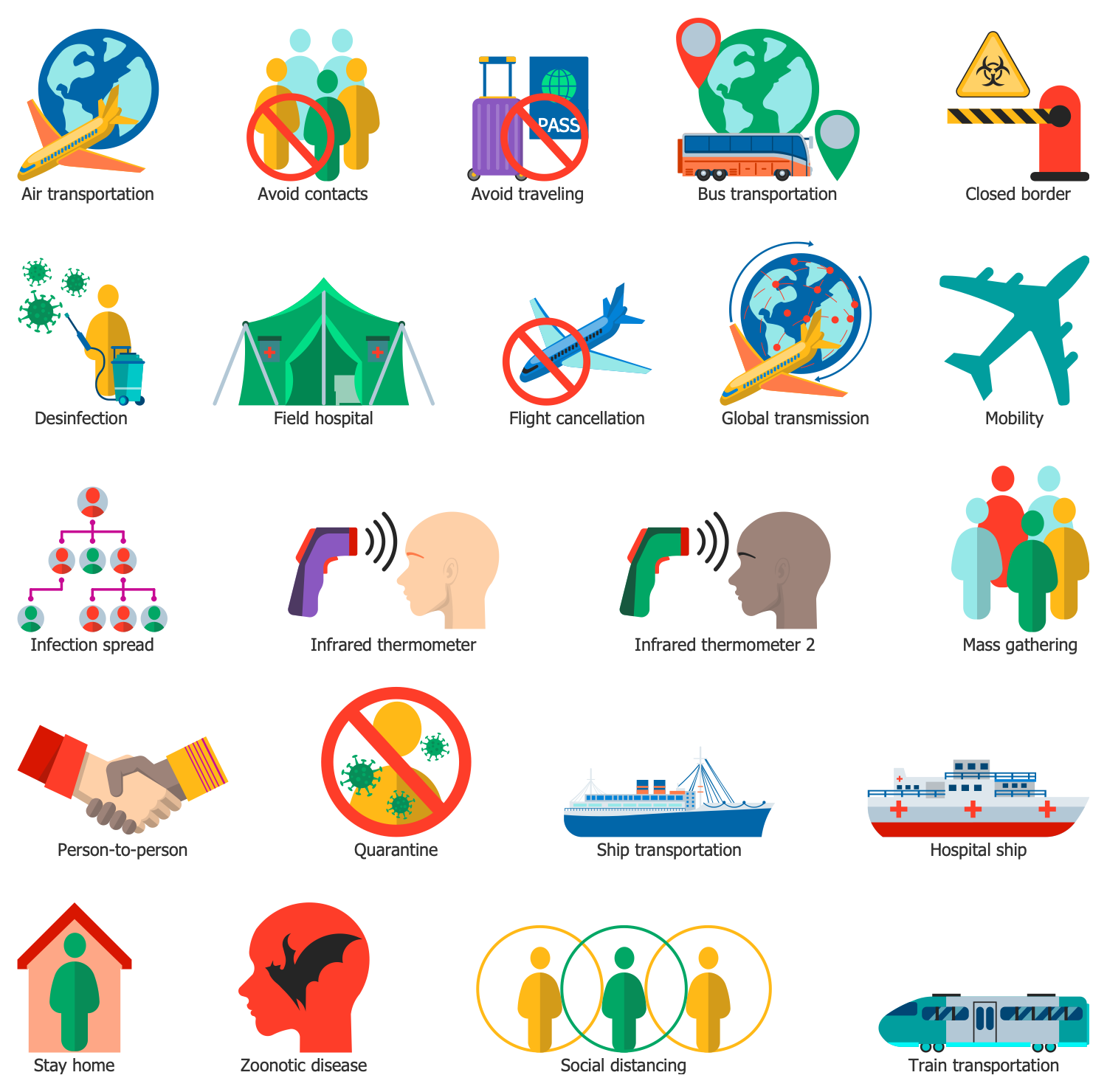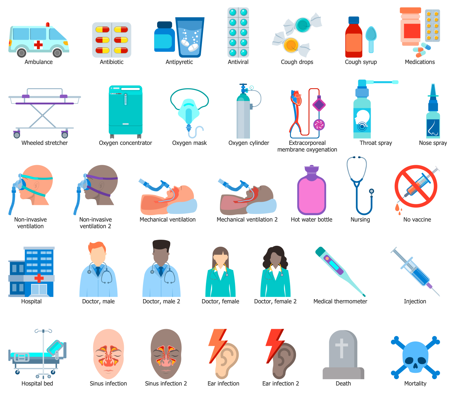 Medical Virology solution extends the functionality of ConceptDraw DIAGRAM with a large collection of medicine and virology vector design objects for designing high-quality illustrations, diagrams, infographics, charts on the medical virology, immunology, healthcare, epidemiology and virus pandemic topics, infection and treatment the viral infection and infectious diseases, vaccination and obtaining herd immunity, presentation slides, web pages and blog posts on microbiology researches, actual virology problems, developing effective vaccines, and immunization. The set of professionally designed samples is included and shows the solution’s power and its ease of use in medical and healthcare illustration design. It is the best solution for medical workers, virologists, microbiologists, immunity specialists, biotechnologists, viruses researchers, medical consultants, professors of medical sciences, lecturers of the medical institutions, health science specialists, marketers in medicine and healthcare field, journalists and editors of medical journals, and other people of medicine-related specialties.