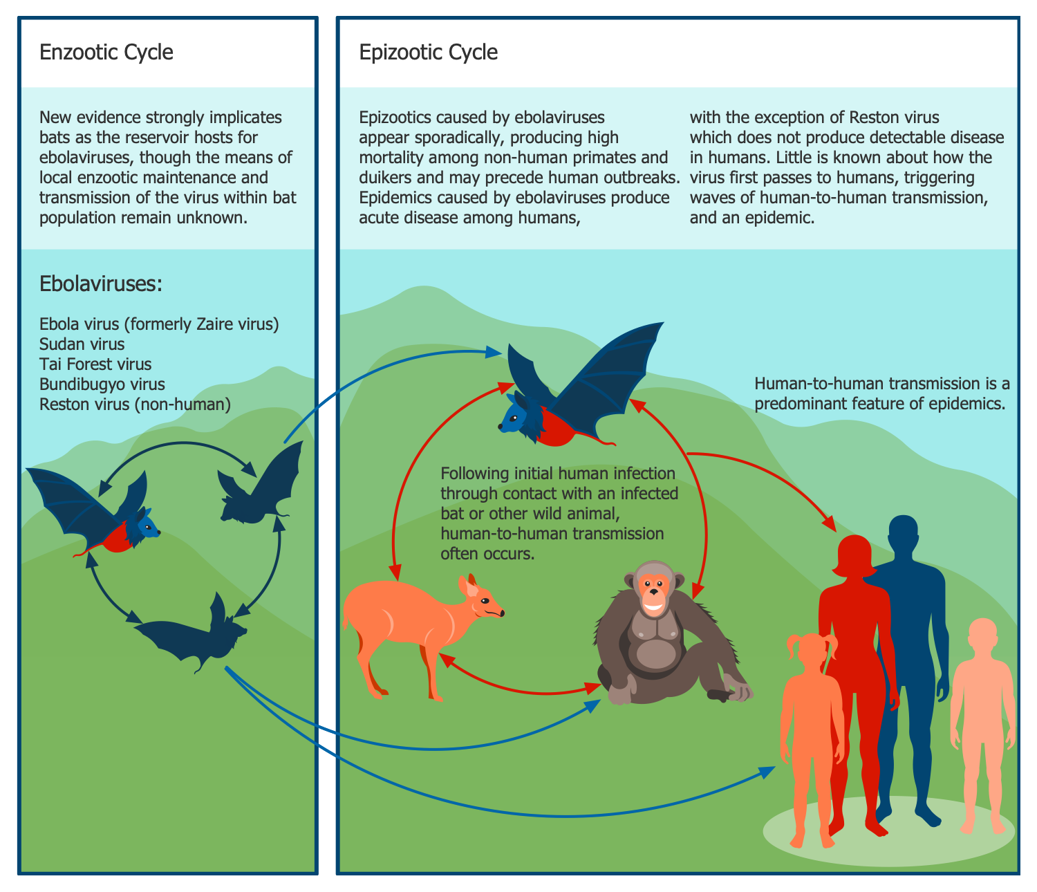 This sample diagram shows the life cycles of the Ebola viral infection, which causes a viral hemorrhagic fever named Ebola virus disease (EVD). It is based on the illustration from the website of the Centers for Disease Control and Prevention. Ebola Virus Disease is a rare and deadly zoonotic disease first discovered in 1976 near the Ebola River in the current Democratic Republic of Congo. The risk of death is 25-90%. Ebola virus most commonly affects people and nonhuman primates, such as monkeys, gorillas, chimpanzees. Five species of Ebola virus were researched: Ebola virus (Zaire virus), Sudan virus, Taï Forest virus, Bundibugyo virus, and Reston virus. The last one causes disease only in nonhuman primates and pigs, not in people. The disease symptoms can reveal in a term from two days to three weeks after contracting with a virus. These are fever, muscular pain, sore throat, headaches, vomiting, diarrhea, rash, decrease of the liver and kidneys functions, internal or external bleeding. One can easily add information about modern researches and vaccines against the Ebola virus in this diagram.
