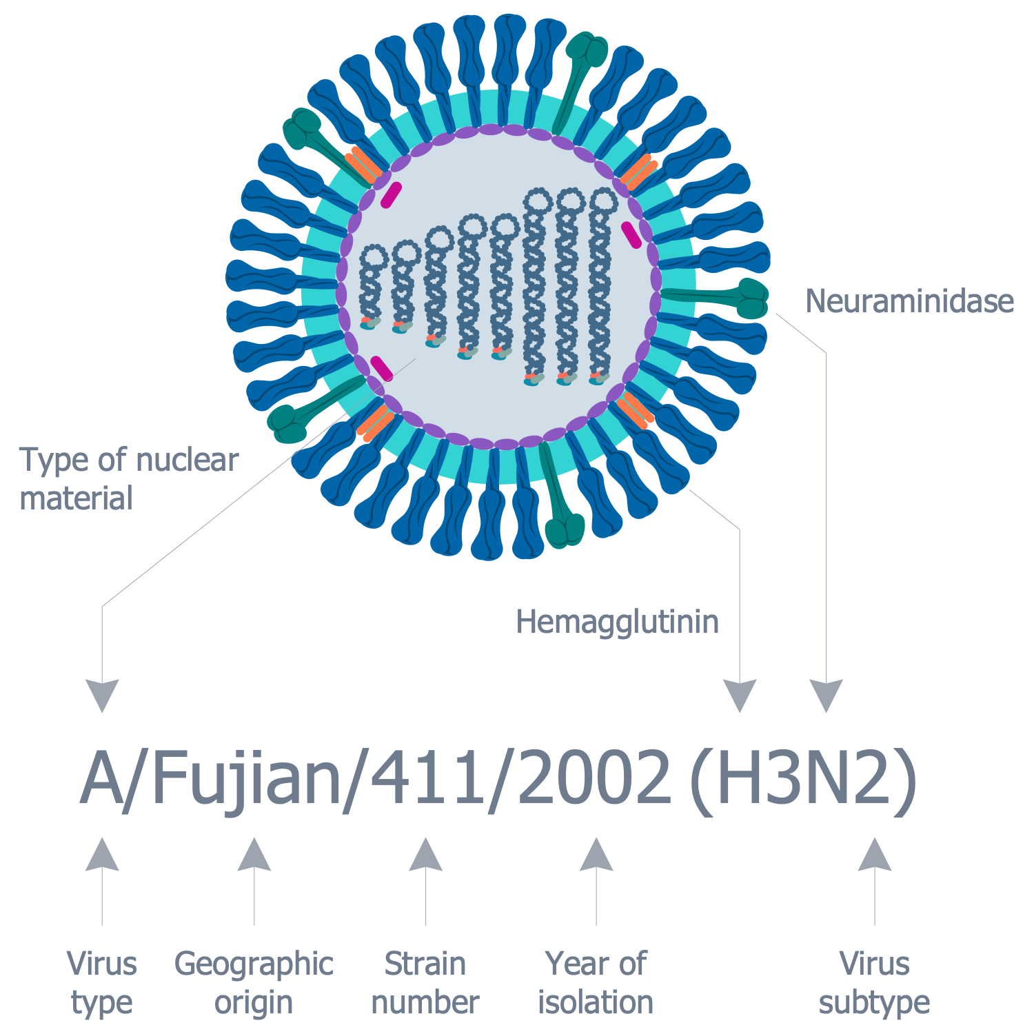 This sample was designed based on the Wikimedia Commons file "InfluenzaNomenclatureDiagram.svg" and illustrates the influenza A virus nomenclature system and the virion structure. The type A viruses cause the most severe diseases and are the most virulent human pathogens. The virion of the influenza A virus is 80–120 nm in diameter and produces ellipsoidal, bacilliform, and filamentous particles. Each detected influenza virus is identified by the virus type, geographic origin where it was first isolated, strain number, year of isolation, and virus subtype (HA and NA). The influenza virion includes the hemagglutinin (HA or H) and neuraminidase (NA or N) proteins on the surface of the particle. Based on these proteins the Influenza A viruses were classified and sixteen H serotypes and nine N serotypes have been identified. This sample shows one of the influenza A viruses — A/Fujian/411/2002 (H3N2). Use Medical Virology solution to succeed in health science and virology illustration.