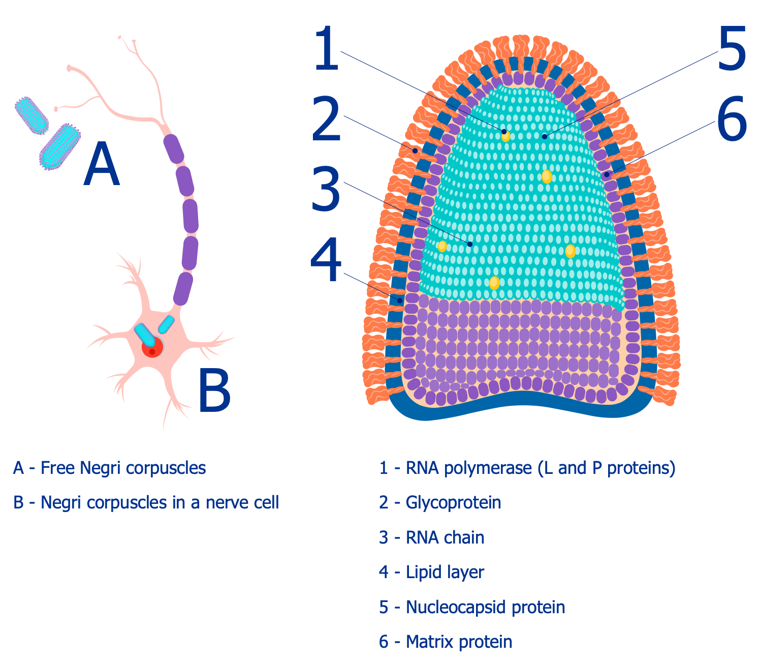 This sample shows the Rabies virus structure and was designed based on the Wikimedia Commons file "Rabid virus schema.png". It is a neurotropic virus that causes rabies in humans and animals. The saliva of animals is the main path of this virus transmission. The Rabies virus is 2–10 µm in diameter, has helical symmetry and cylindrical morphology, is enveloped and has a single-stranded RNA genome with negative-sense. The genetic information is contained in a ribonucleoprotein core (RNP). The RNA genome of the virus encodes five proteins: nucleoprotein (N), glycoprotein (G), phosphoprotein (P), matrix protein (M), and viral RNA polymerase (L). The genomic RNA is tightly encased by the nucleoprotein, the phosphoprotein and polymerase are associated with the RNP, the glycoprotein forms the spikes on the virus surface, M protein is associated with both RNP and the envelope. The transcription and replication occur in the cytoplasm inside the Negri body.