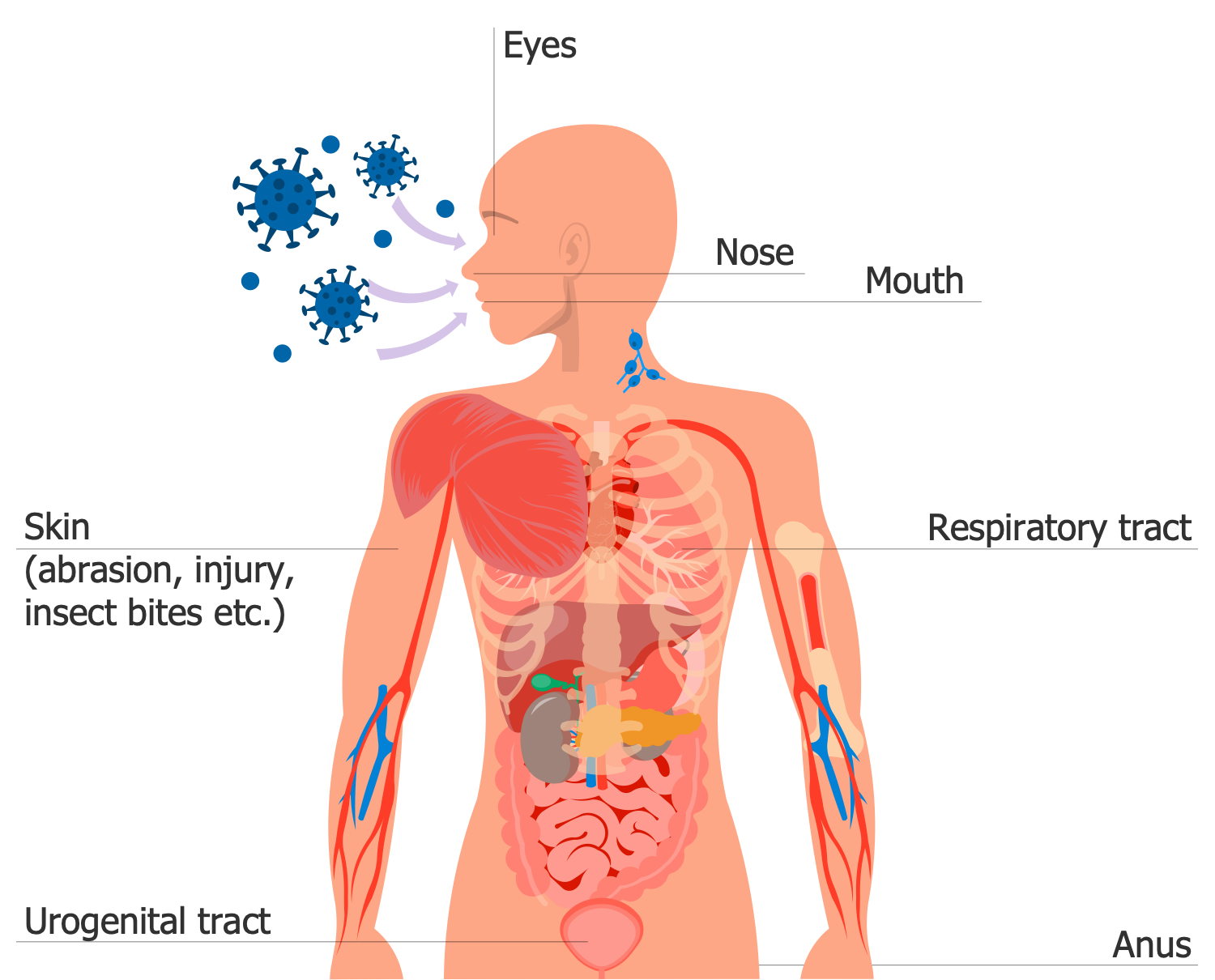 This sample infographic shows the typical pathways for viruses to enter the human body before they multiply, causing harm and destroying the body. The sample was designed based on the Wikimedia Commons file "Typical sites of virus entry into the body.png". The whole set of sites where the virus can be implanted into the body is determined, including damaged areas of the skin, such as various abrasion, cuts, injury, insect bites, and various organs — nose, mouth, eyes, respiratory tract, urogenital system. The vector clipart of the upper part of the human body was used for this visual diagram from the solution's libraries. If needed, this infographic can be easily supplemented with the names of viruses that enter through the listed parts of a body and infect them, information about the stages the viruses pass after the entering the host cells and processes they provoke, immunization, and herd immunity formation.