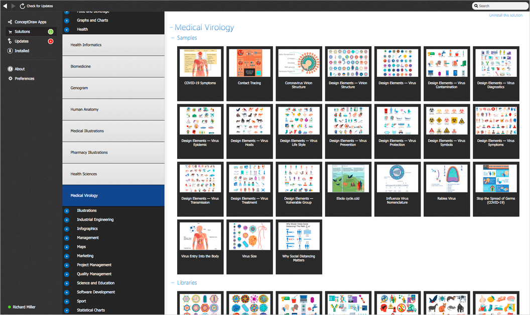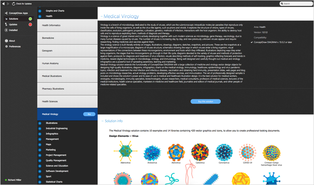 After ConceptDraw DIAGRAM is installed, the Medical Virology solution can be purchased either from the Health area of ConceptDraw STORE itself or from our online store. Thus, you will be able to use the Medical Virology solution straight after.