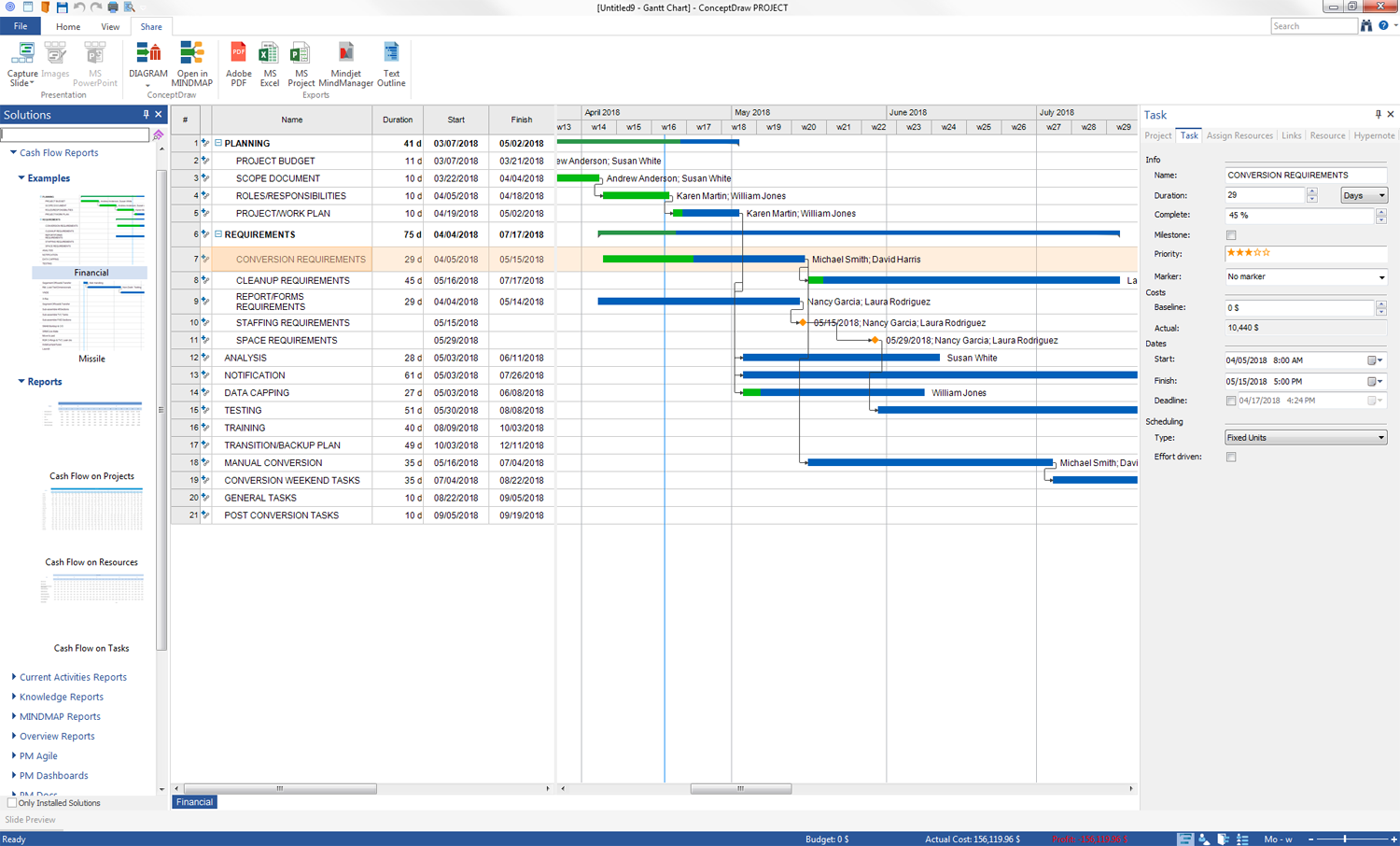 Typically, all projects and especially business ones are somehow related to finances, costs and profits. The planning and allocation of project’s budget are one of the most important moments at the stage of project’s planning. While at the stage of project implementation, the monitoring and analysis of costs, of actual cost of the whole project and its profits are systematically carried out. This example represents the detailed financial project. Included in the Cash Flow Reports solution, this example is ideal for testing the reports of this solution, such as Cash Flow On Projects, Cash Flow On Resources, Cash Flow On Tasks reports, and lets one learn more the solution’s capabilities.