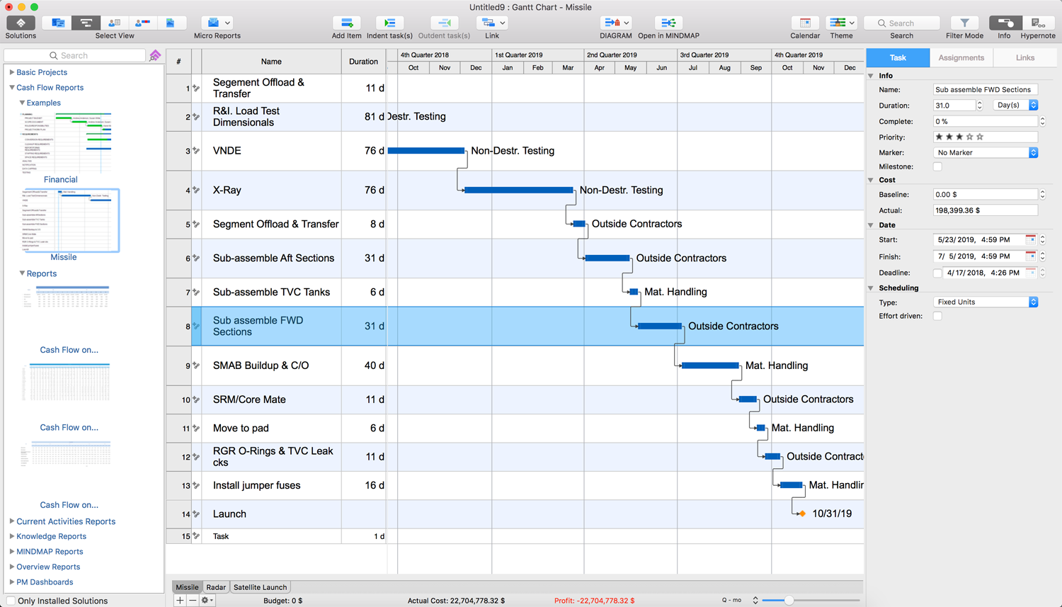 This project example describes the assembly stages of all sections of a missile and preparation for its launch. The clear systematization of tasks and setting deadlines for each of them allows you to monitor whether the project will be completed on time and to take timely the corrective actions if something went wrong. The project's finish date is designated as a milestone on this project's Gantt Chart. Besides, testing the reports of the Cash Flow Reports solution on this example you will better comprehend what result you will achieve applying them to your own projects.