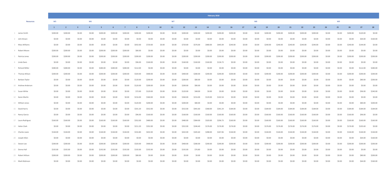 The “Cash Flow on Resources” report formed for your project is a spreadsheet gathering the information about daily labour expenses of each work resource involved in your project. By default, this report is generated for a current month, though you can change the reporting period to any desired one directly before generating this report. Each project from the multiproject is placed on its own sheet in this report.