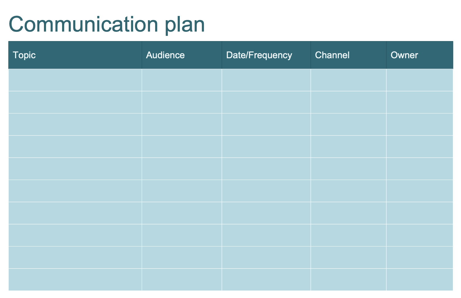 This template is a Communication plan table, which includes five columns to be filled with your own data: topic, audience, date/frequency, channel, and owner. The communication plan is a simple tool, but it is really important for any project, because effective communication underlies the success of the project. The Communication plan allows effective communication on a project with team, clients, and other stakeholders. It is a way to convey the project information to each team member in an understandable and actionable form. The communication plans define how the project communication will be done, how the information will be shared, what tools will be used, and who is responsible and involved in project communication. They can significantly differ and must be constructed in the context of exactly your organization and specific project. Having a clear Communication plan you receive a lot of benefits, among them the opportunities for feedback to be shared, increasing the productivity of team meetings, and much more.