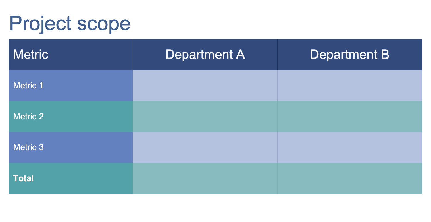 This template represents the table of project benefits to be filled in the ConceptDraw DIAGRAM. Three columns of this table depict a set of metrics and values for department A and department B correspondingly. For each metric is provided its own row in a table. Three metrics are presented, but you can increase their number, as much as you need, as well as the number of departments and so the columns. The last row is allocated to represent the total values for each department. The table can be further used to construct a Bar Chart, Pie Chart, or any other visual diagram in ConceptDraw DIAGRAM software with the aim to display and to analyze the results of the company’s work, to highlight its benefits and to increase productivity. The tables and visual diagrams of different types are useful for both the internal planning the projects and visual presentation to the client.