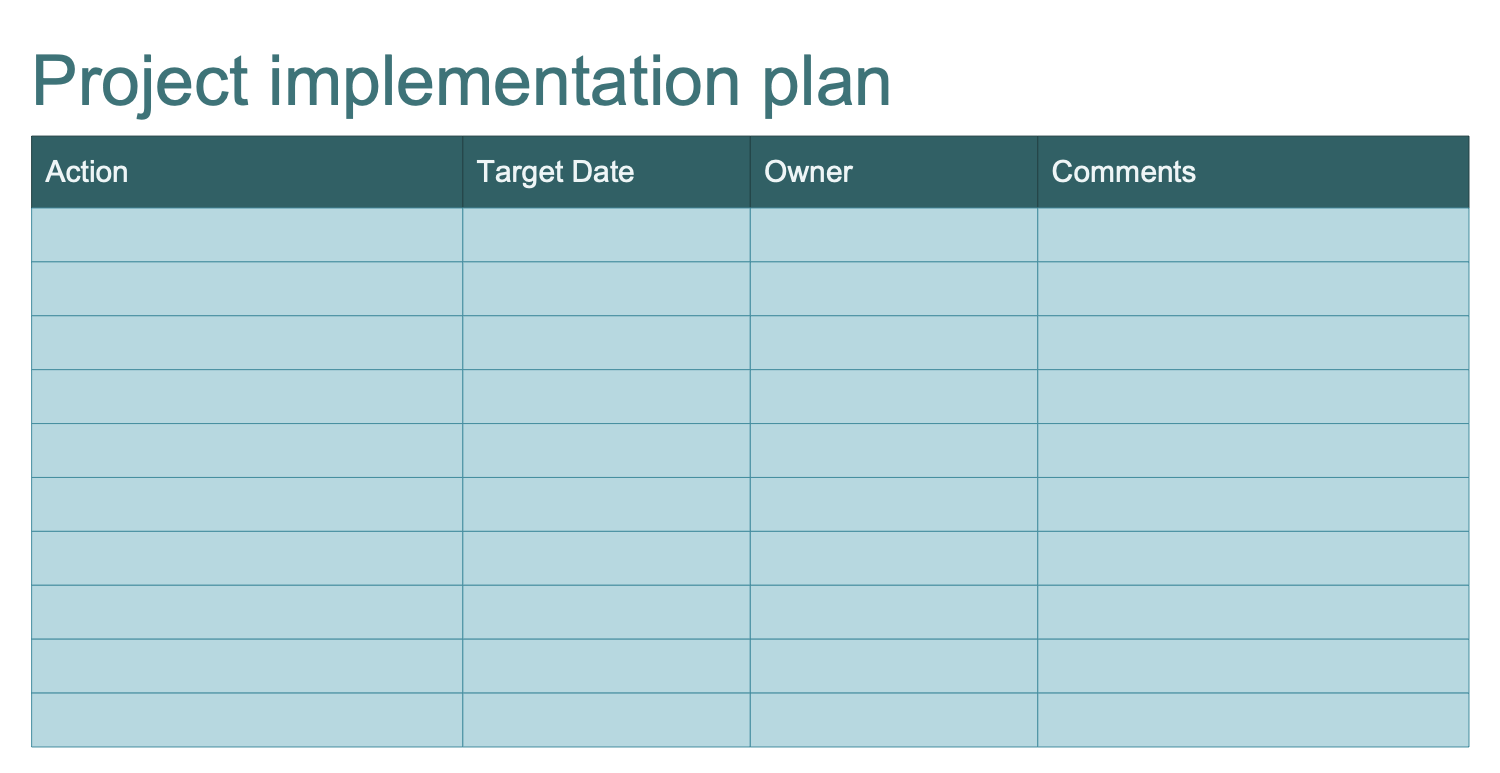 This template represents the Implementation plan table, which is a detailed plan prepared by the project managers, team leaders or developers before starting the work on a project. This is a kind of step-by-step instructions to perform each task, written for all project participants. Implementation plan is used in project scope management to document the project’s tasks; responsibilities for each of them, associated target dates and task dependencies. This is a plan that helps to see the full scope of tasks, to understand the requirements of each task, to think through the implementation, to estimate the time needed for implementation as exactly as possible, to understand the complexities and confusing moments. Thus, the Implementation plans provide a clear structure of project implementation stages and the ability to track progress and project status at any given time, to save time and allow one to optimize the development process. The information according to the actions to be done, target dates, owners, and additional comments are entered into four columns of this table.