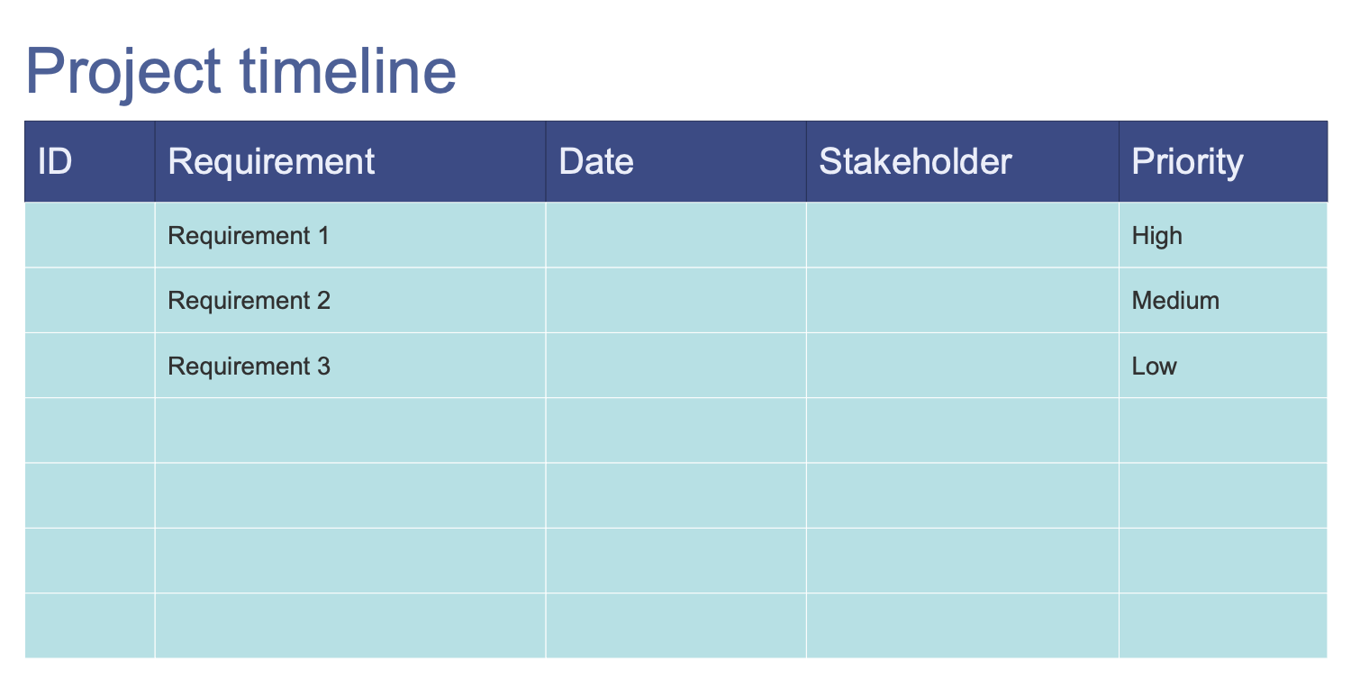 This template is a plan table used to list project requirements that provide a clear idea of the set of tasks that must be accomplished to successfully complete the project. Project requirements allow achieving the desired results, finding a solution that fully requires the true needs of the organization, making stakeholders happy with the final output of the project. The project requirements approval must be carried out at the project planning stage, before starting its implementation. At this notice that requirements demand a clear and comprehensive statement, only this, as well as your attentiveness on both planning and implementation stages can guarantee the final project success. In this context, there may be a problem with insufficient involvement of all stakeholders in the process of discussing requirements that further can affect the project realization, try to avoid this in your project. Incorporate the collaborative meetings with all stakeholders to formulate the clear requirements and enter them into the offered table template, which contains five columns: ID, requirement, date, stakeholder, and priority.