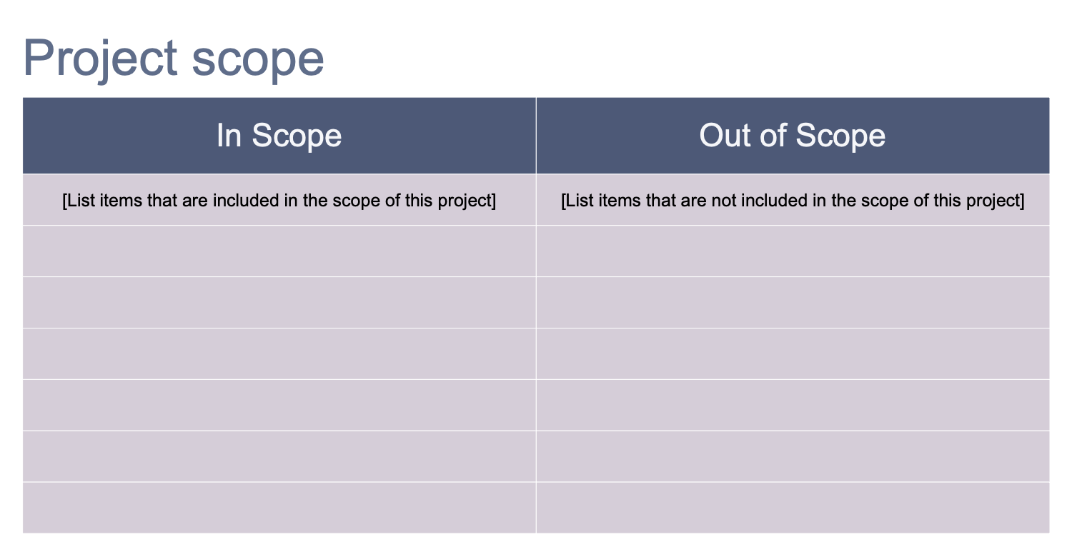 This template offers a table representing the project scope, items included in the scope and those that are out of scope. Project scope is a tool used to describe the project, its content, boundaries, project goals and steps to their achievement, tasks and key milestones, high-level requirements, responsibilities for each team member, costs and deadlines, assumptions, constraints, major deliverables with clarification which are in and out of scope. This is an important part of project planning which includes determining and documenting the listed information, for example in the form of a table. During the project implementation, this documentation helps the project team to evaluate project goals and timelines, to make correct decisions and to focus on the important tasks. The activity or project item that goes beyond the project boundaries is considered to be “out of scope”, therefore it is not planned and placed in the second table column, while the first column includes only the items and tasks within project boundaries.
