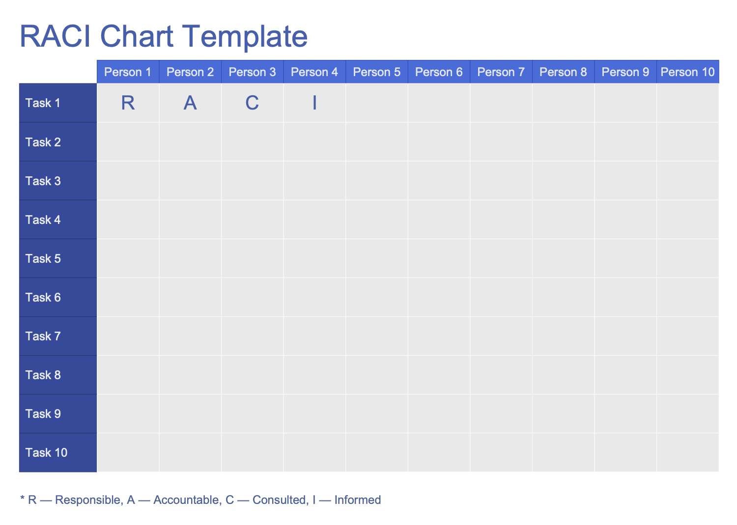This template represents a RACI matrix describing the participation of different roles in completing tasks, projects, or business processes. It is especially useful during the project planning stage when the roles and responsibilities in projects and processes are assigned. RACI is an acronym derived from four commonly used responsibilities: Responsible, Accountable, Consulted, and Informed. Responsible is a person who does the work to complete the task. Accountable is a person who is responsible for the correctness and thorough of task execution and finally approves the work. Consulted is an expert whose opinion is requested on specific issues and with whom is set a two-way communication. Informed is a person who is constantly aware of task progress, only one-way communication is set with him. Often, a role can perform different tasks and can be accountable and responsible at the same time. But it is recommended that each role in a project or process receives only one type of participation for each task. This template table includes columns and rows corresponding to persons and tasks to be filled with your data.