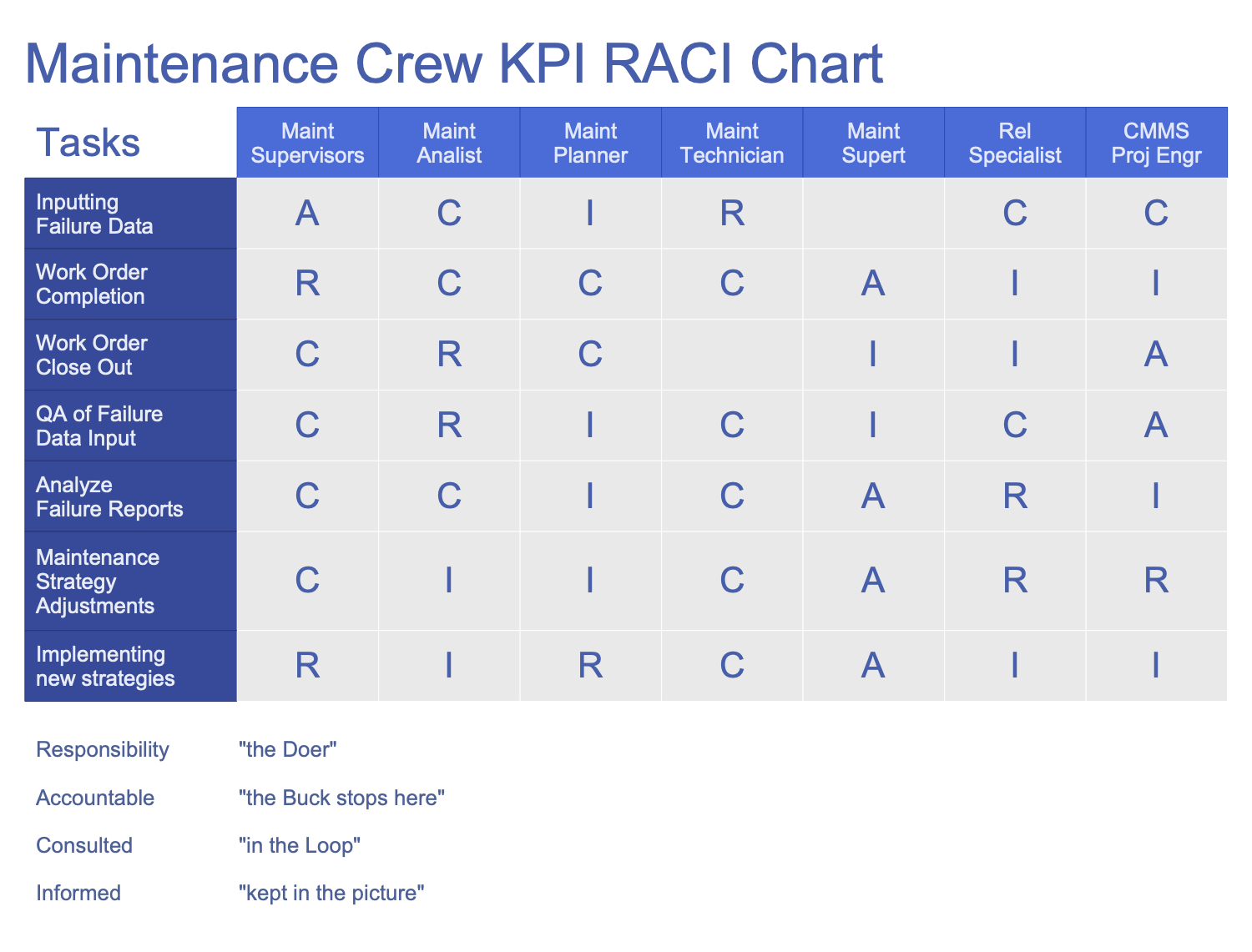This sample represents a Maintenance Crew KPI Chart in the form of a RACI matrix. The RACI matrix is a simple project management tool that allows assigning roles and responsibilities during the decision making process. This popular tool lets one to avoid confusion when performing tasks or processes and to facilitate the project management process. According to the RACI methodology, regardless of the complexity and scope of work a member of the project team performs one of four roles: Responsible, Accountable, Consulted, and Informed. This RACI matrix was created with columns representing roles and rows depicting tasks. The roles involved in this project are Maint Supervisors, Maint Analyst, Maint Planner, Maint Technician, Maint Supert, Rel Specialist, and CMMS Proj Engr. The main project tasks are: entering failure data, work order completion, work order close out, QA of failure data input, analyze failure reports, maintenance strategy adjustments, implementing new strategies. The cells of the matrix are filled with the responsibilities of each role according to the tasks listed.
