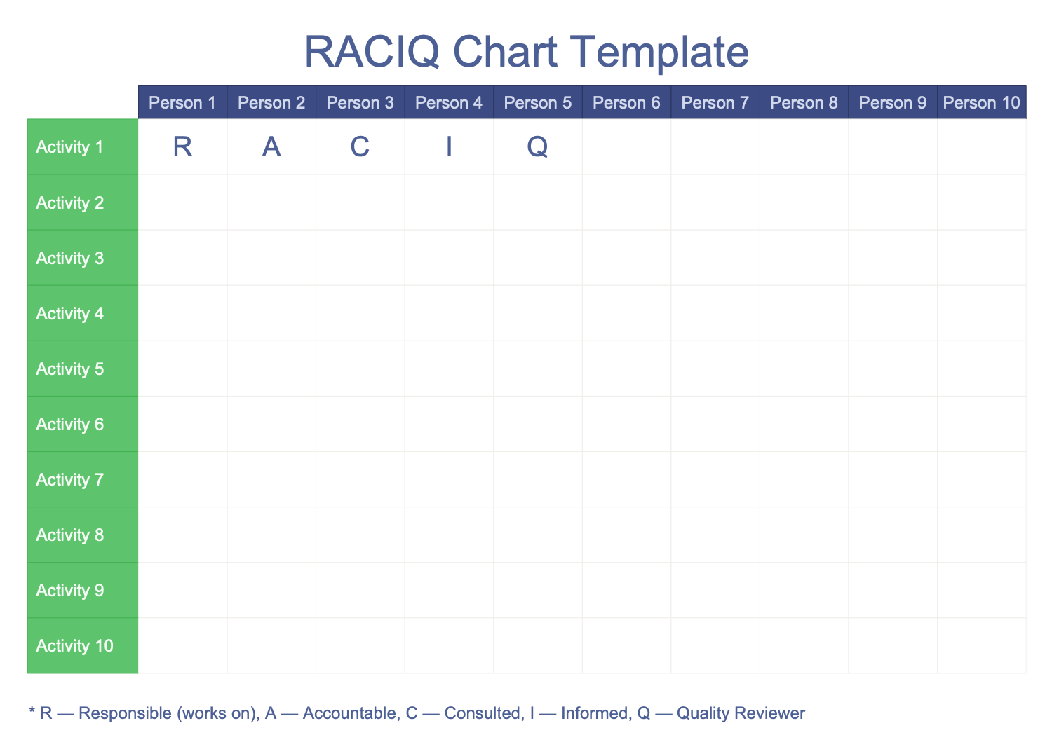 This template demonstrates a RACIQ chart that is an expanded version of the standard RACI matrix known as a simple and effective human resource planning tool. The abbreviation includes four roles belonging to RACI and one more specific: Responsible (R), Accountable (A), Consulted (C), Informed (I), and additional participation type Quality Review (Q) — a person who checks the product's quality. According to RACIQ methodology, regardless the complexity and scope of work, a team member of any project performs one of five listed roles. A role is not necessarily a single person; it can be a descriptor for a related set of tasks and can be performed by multiple people, just as a single person can perform multiple roles. As a rule, the accountable role is held by one person per task. A well-constructed RACI responsibility matrix allows solving the problem of incorrect distribution of functions between team members. Use this template as a perfect basis for your RACIQ charts.