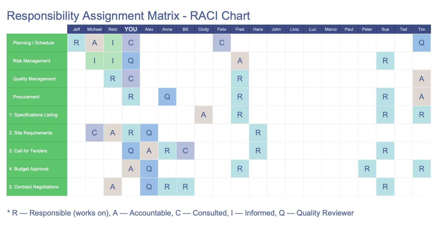 This sample illustrates the Responsibility Assignment Matrix – RACIQ Chart. You can observe the list of activities for the business project by rows and also the list of involved persons by columns. Each person performs one of five roles in a project according to the RACIQ abbreviation: Responsible (R) — a person that directly executes the work, Accountable (A) — a person that approves the work and is responsible for the correctness of execution, Consulted (C) — an employee that is consulted about the task execution, Informed (I) — an employee who is notified when a specific task is completed, Quality Review (Q) — a person checking whether the product meets the quality requirements. You can see the roles assigned to team members in the matrix cells. The cells are visually highlighted with different colors in accordance with the assigned role. The column “YOU” is additionally marked by capital letters to be found instantly.