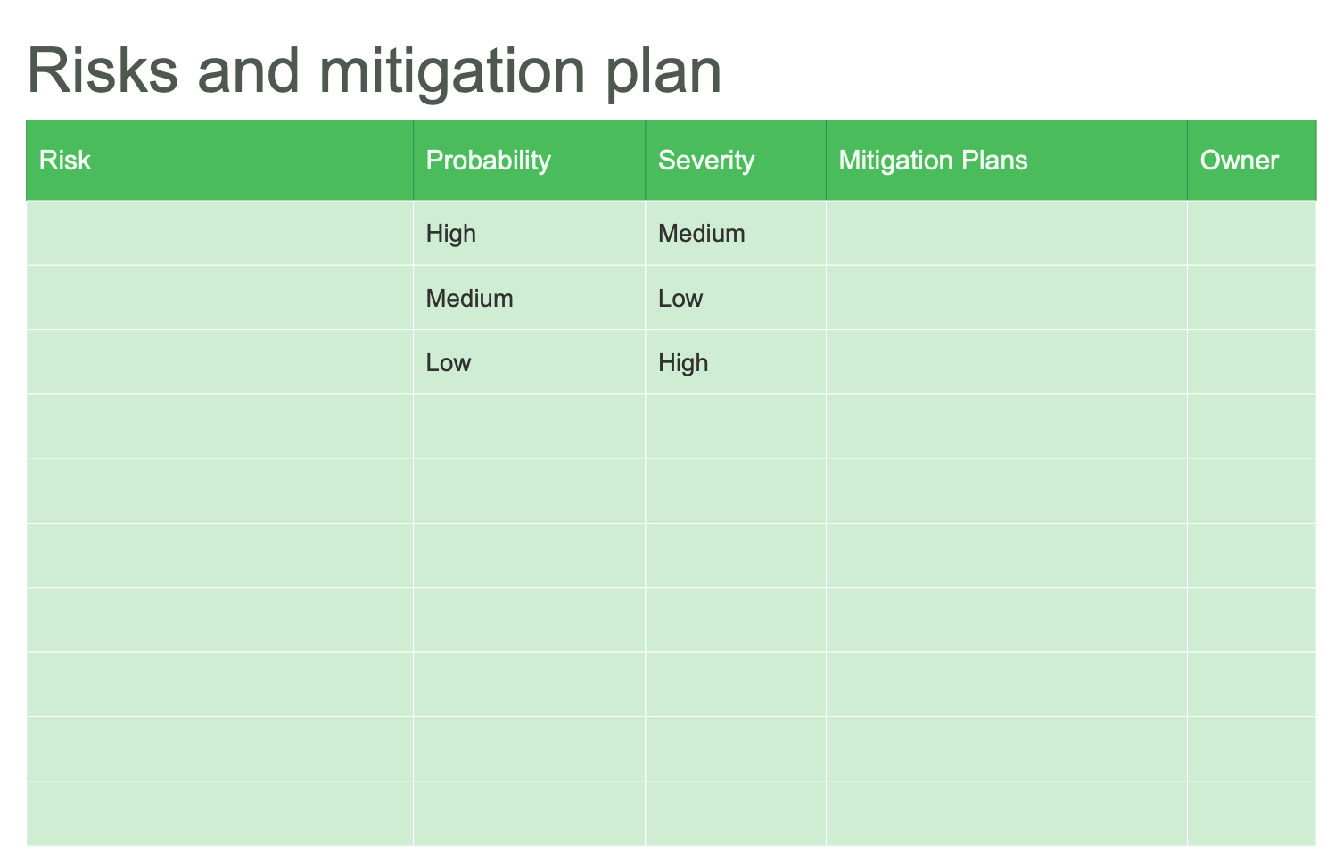 This template was designed to help build a project risk and mitigation plan table. Risk mitigation is a strategy aimed at reducing the likelihood of risks by taking active and proactive actions, or at least reducing their impact and adverse effects. Risk mitigation is one of the elements of risk management with the main goal to prepare a business for all potential risks. Its implementation differs from one organization to another. It is rational to plan the risks mitigation prior to the event occurring to reduce unfavorable effects, in this way the identification as many potential risks as possible is recommended. The prediction and timely identification of risks avoids their occurrence. Risk mitigation also focuses on the inevitability of some disasters, when a threat cannot be avoided entirely. The table contains five columns for filling with data concerning your organization: risk, probability and severity (high, medium, or low), mitigation plans, and owner.