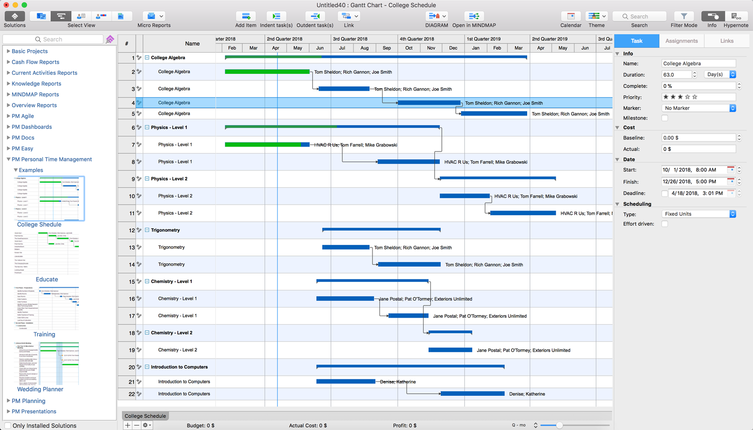 This example represents the college schedule organized in a form of a project constructed in the ConceptDraw PROJECT software. You can observe all courses proposed in a given college, such as college algebra, trigonometry, physics, chemistry, introduction to computers, and the time periods in which each of them will be taught, as well as the corresponding lecturers. Some subjects begin on the same date; two courses (physics and chemistry) are divided into two levels with a different duration and number of allocated educational hours. This project can be taken as a template and slightly changed from year to year.
