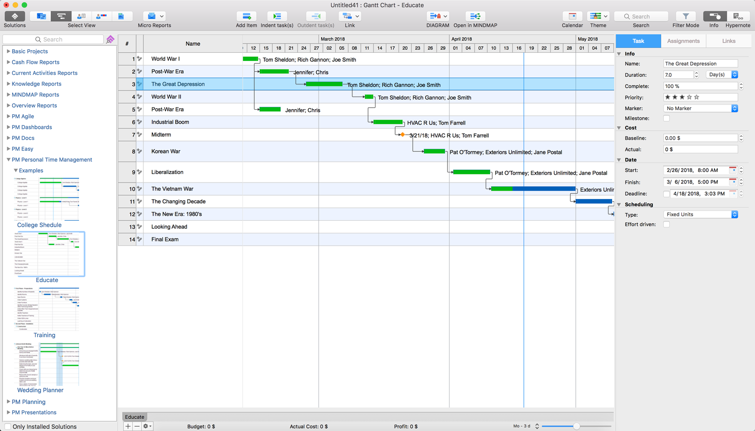 This example is dedicated to the education in a field of history. The list of themes to be learned is represented as a table with additional information, such as the number of days allocated for learning each theme (duration), start and finish dates, number of educational hours and teachers' names. The themes' order corresponds to the approved educational program. At the end of this list, you can discover the date of the examination designated as a milestone and the examiner's name. The Gantt Chart is convenient for tracking the educational program's execution. The program of study any other subject can be presented in a similar way within a few minutes.