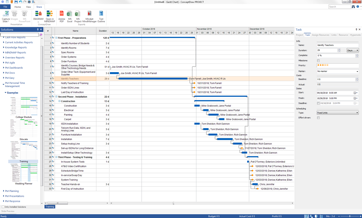 The training process requires a precise planning and special preparations. This project example plans and describes in detail the process of preparation for the training. Three phases of works are designated: Preparations, Installation, Testing & Training. Quite a lot of listed works are milestones. As for the work resources involved in this project, assigned to the works and observed on a Gantt Chart near the tasks' bars and in the tabular part, the full list of them can be found in the project's Resources tab in the ConceptDraw PROJECT application. There are also defined their types, costs per hour, groups, e-mail addresses and additional notes.