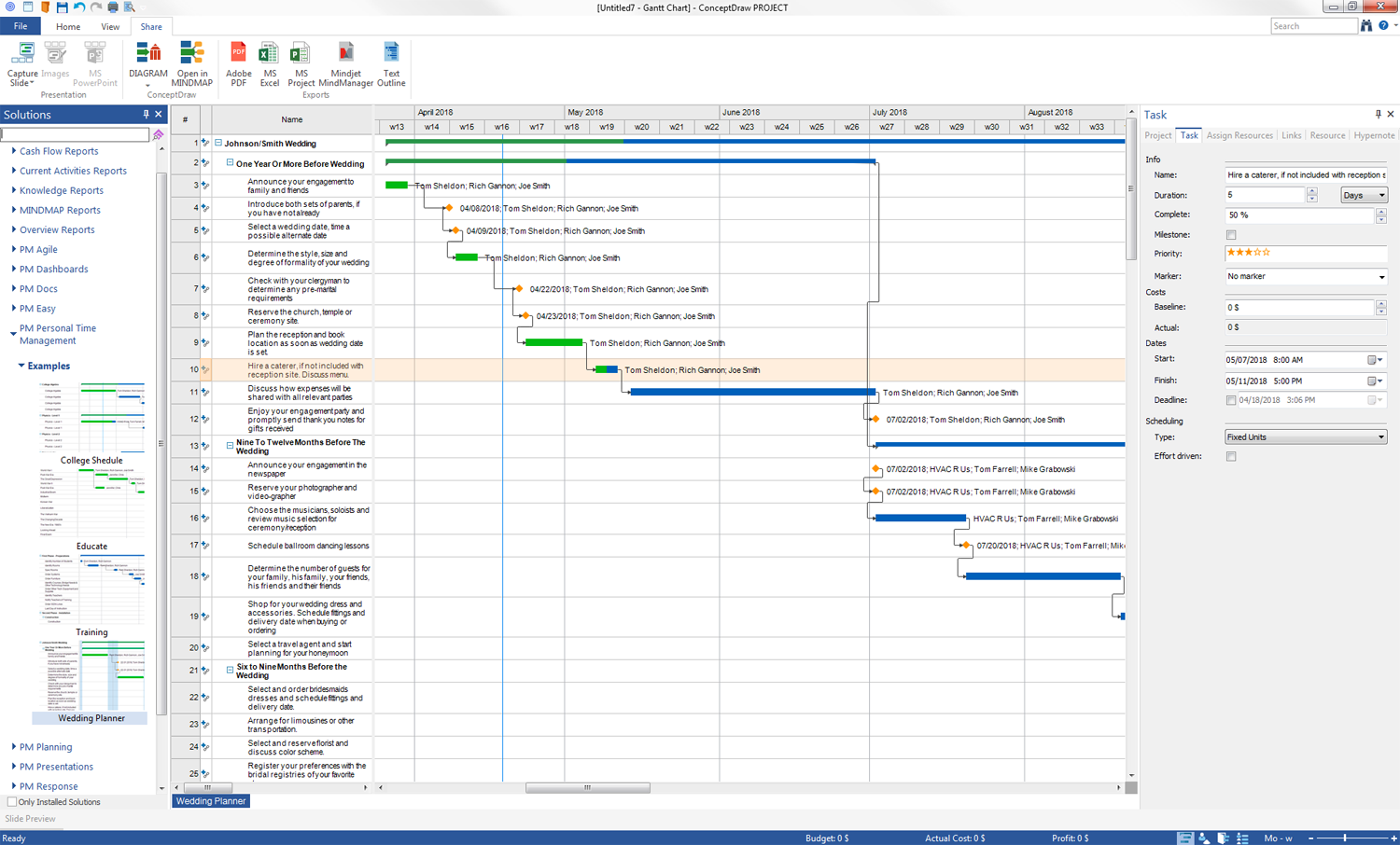 A wedding is one of the most significant events in a human's life, so each couple tries to plan this day and the wedding ceremony itself to the finest details in order to enjoy the wedding day as much as possible. This project example depicts the plan of Johnson / Smith wedding. Moreover, there are thought-out and presented events and actions not only of the wedding day itself, but also there are listed the actions that need to be taken lots months before the wedding day, as well as after it. Planning your own wedding, you can use this excellently detailed and helpful plan as the base, certainly modified it according to your liking, preferences and time available.