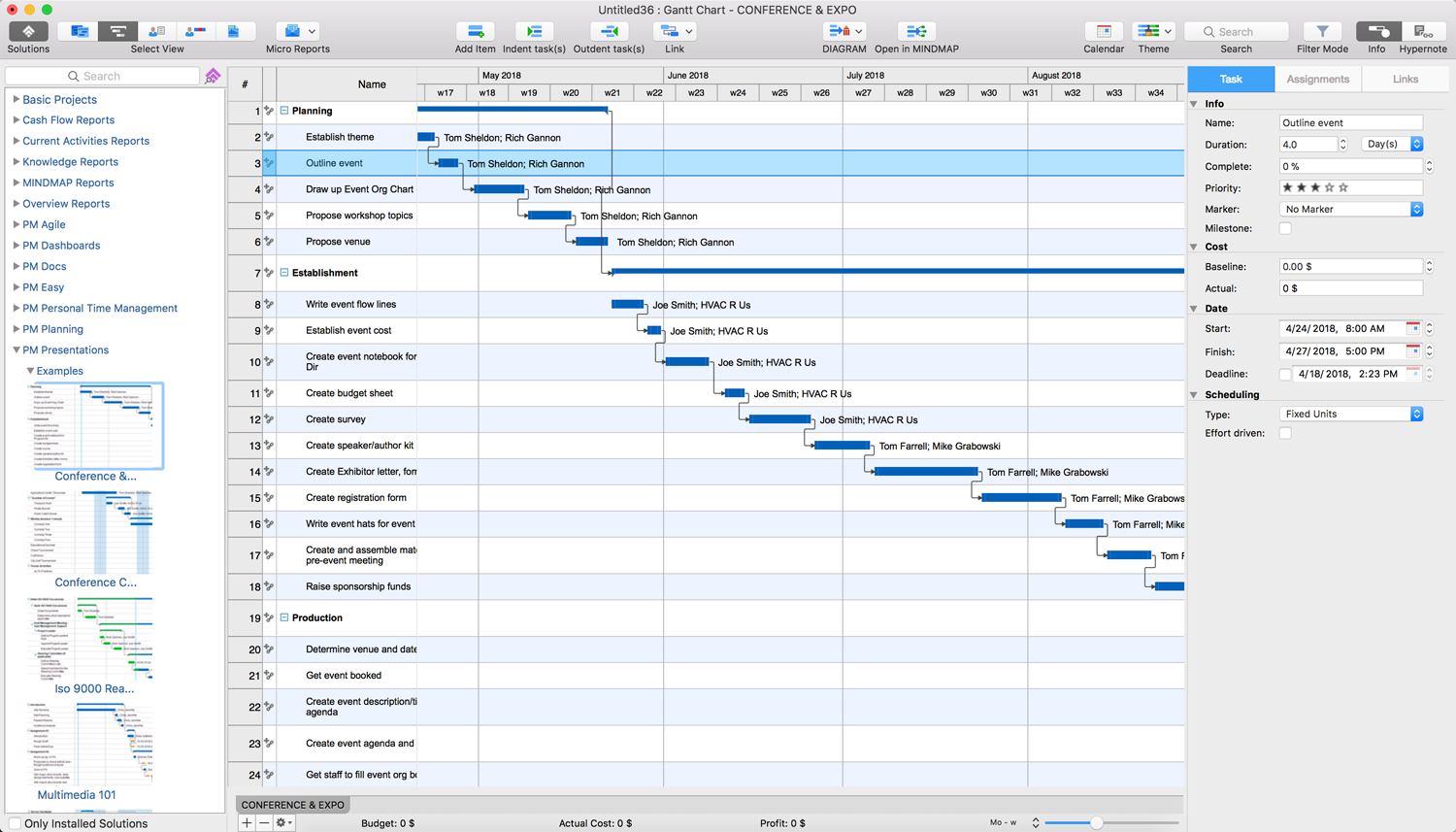 This project example is dedicated to the planning and conducting such events as conference and expo. It includes a large number of phases and tasks, which require a precise implementation, however, the ConceptDraw PROJECT software perfectly copes with planning projects of any complexity, as well as tracking the progress during their implementation. This project describes in detail the tasks on planning, establishment, production and conduction this event. A separate part of works is devoted to this event's promotion, creation and distribution of different kinds of promotion materials, making press releases and Internet post notices. The final phase is allocated for the post-event actions, such as writing thanks and reports, summarizing financial totals, submitting photos, press blurbs and event reviews to media.