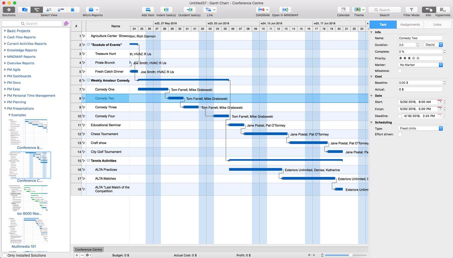 This example represents the schedule of events at the Conference Centre, such as, for example, educational seminar, craft show, chess tournament, tennis practices and matches, thematic brunches and dinners, comedies sessions, etc. For each event, there are indicated the dates of its conduction, duration in days, cost, priority, responsible employees and their employment in a corresponding project in hours. You can observe the list of events at the left part of this example and at the right is placed the graphical Gantt Chart, which depicts visually the sequence of events' conduction, names of responsible people and events' statuses, which events are already over, which are being conducted now and which ones will be soon.